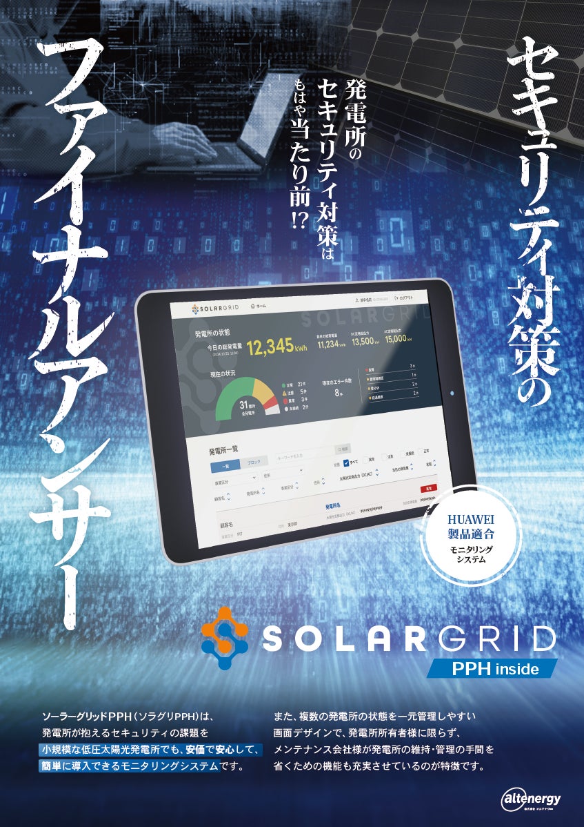 株式会社オルテナジー(本社:東京都、代表取締役社長:髙橋眞剛)は、太陽光発電等の分散型エネルギーシステムに対応する次世代遠隔監視システム『ソーラーグリッドPPH(Public Power Hub)』(以下、ソラグリPPH)の提案を開始しました。