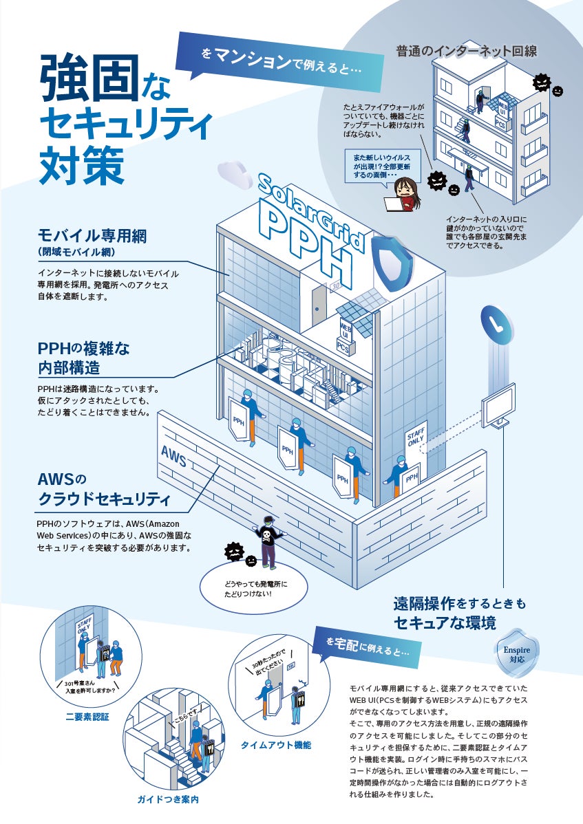セキュリティ面ではインターネットに接続しないモバイル専用網を採用し、発電所へのアクセスを遮断。仮にサイバー攻撃を受けても迷路構造により到達を困難にしています。