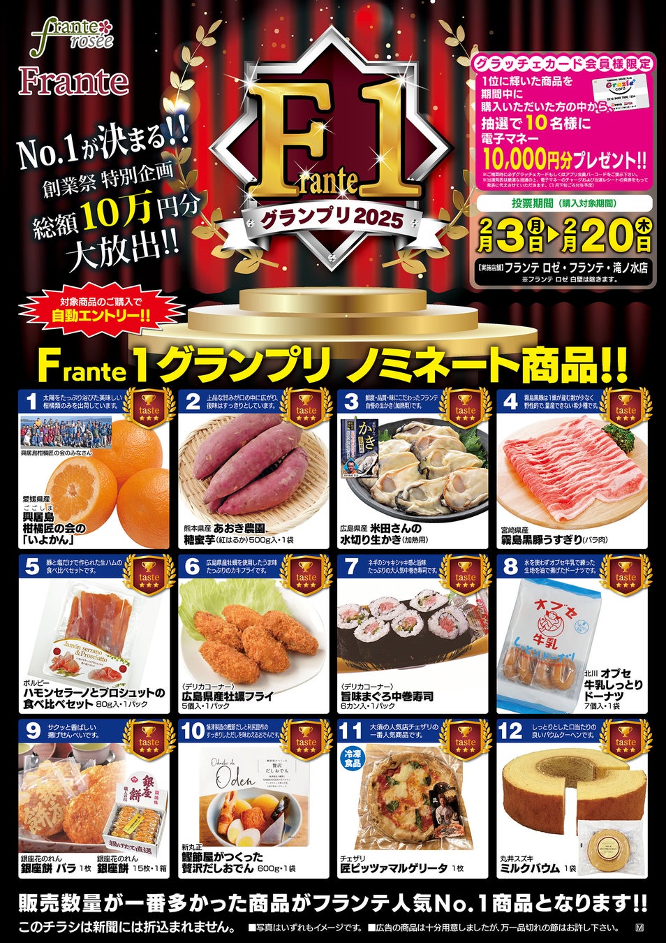 『Y-1GP(ヤマワングランプリ)』『F-1GP(フランテナンバーワングランプリ)』は、2月3日(月)から2月20日(木)の購入対象期間にノミネートされたバイヤーのおすすめ商品をお買い上げいただき、販売数量が一番多かった商品=人気No.1商品を決定する特別企画です。1位に輝いた商品を購入していただいたグラッチェカード会員様に抽選で、総額500,000円分のポイント&電子マネーをプレゼントいたします。