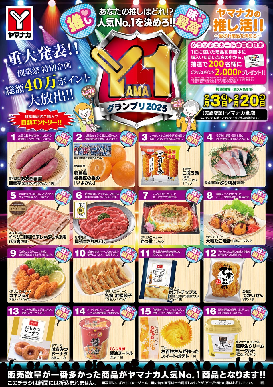 株式会社ヤマナカ(本社:愛知県名古屋市、代表:中野 義久)は、2025年2月7日(金)に創業103周年を迎えます。お客様への感謝とお買い物を楽しんでいただきたいという想いを込めて、創業祭特別企画を2月3日(月)より、ヤマナカ全店で『Y-1GP(ヤマワングランプリ)』、フランテおよびフランテ ロゼにて『F-1GP(フランテナンバーワングランプリ)』を開催いたします!