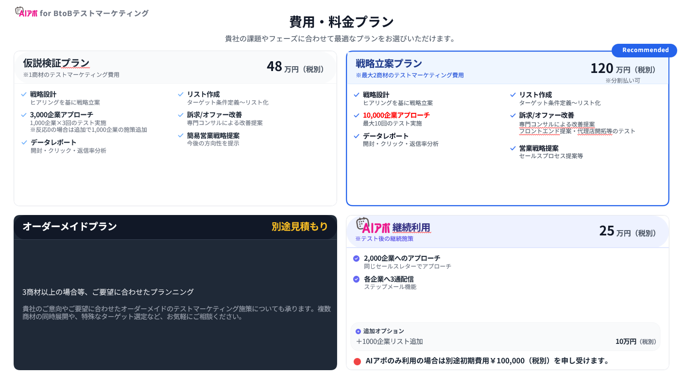 セールスプロセス株式会社(所在地:東京都渋谷区、代表取締役:梶田洋平)は、BtoB企業向けのテストマーケティングサービス「AIアポ for BtoBテストマーケティング」(https://btob-test-marketing.com/)を提供開始しました。