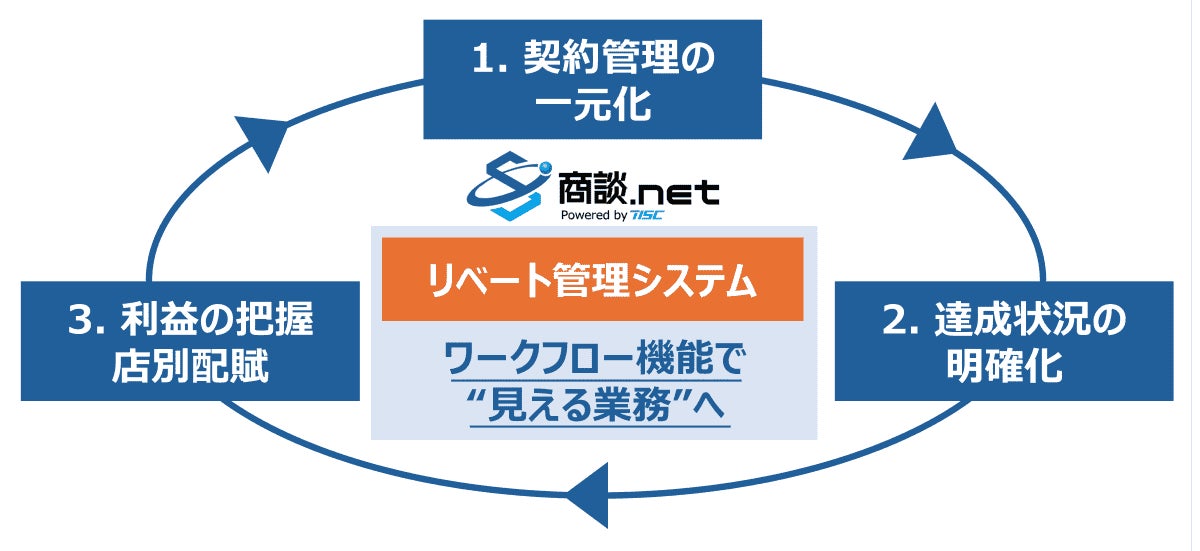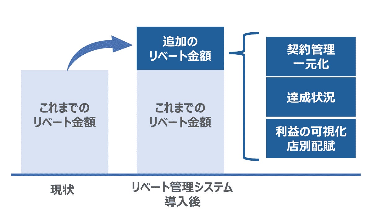 「リベート管理システム」とは、小売業と取引先との間で発生するリベート契約・達成状況・入金・利益配賦を一元管理する仕組みです。