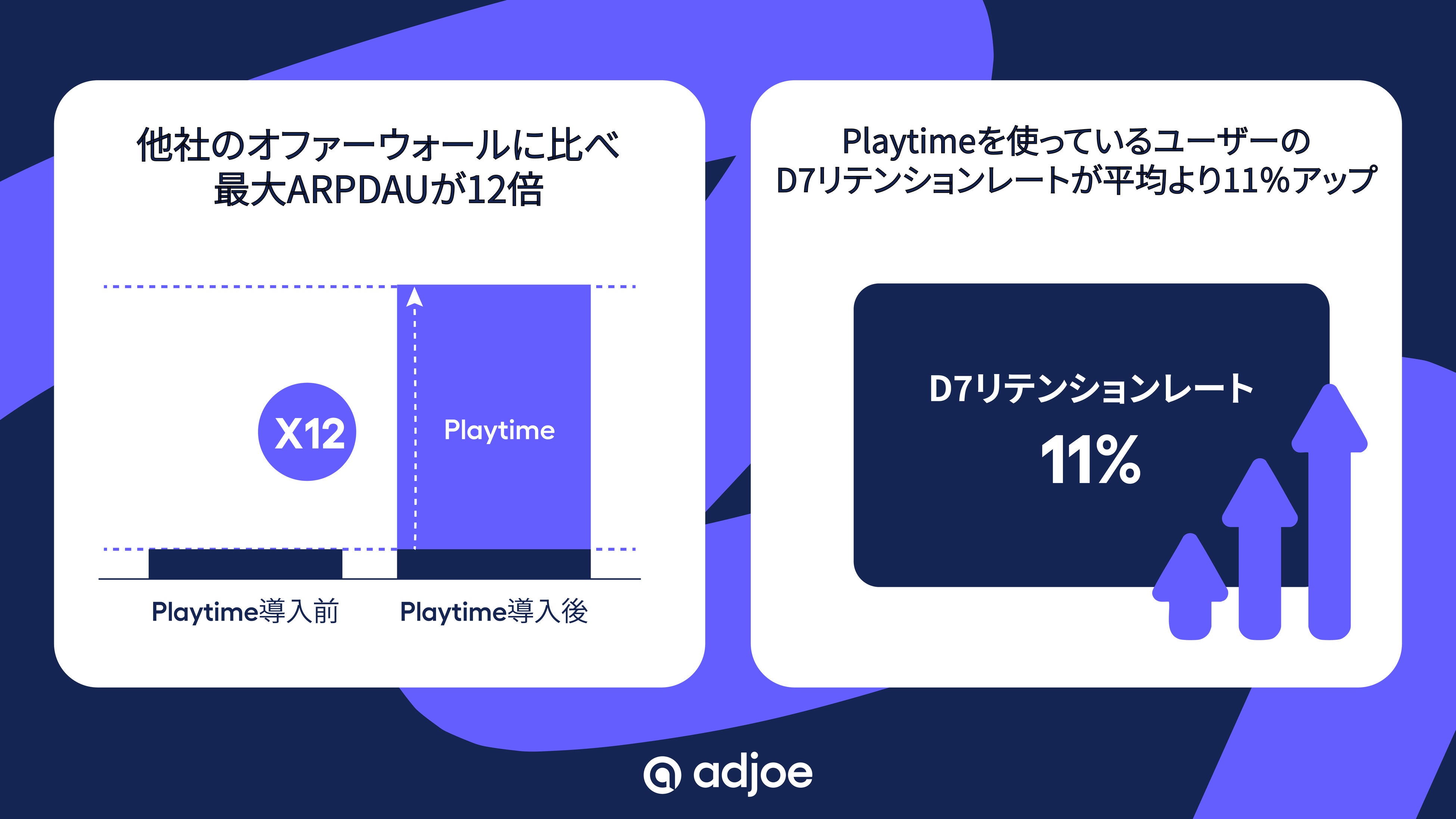 Playtime の導入により、ARPDAU(広告視聴ユーザー1人あたりの1日平均収益)は他社オファーウォール比で最大12倍を記録し、アプリ全体の売上も2倍に伸長。さらに、Playtime利用ユーザーのD7リテンション(7日後継続率)は平均に比べて11%高いという数値を達成し、勉強の合間にゲームをしていたユーザーは、英語学習を継続する可能性も高かったことが伺えます。