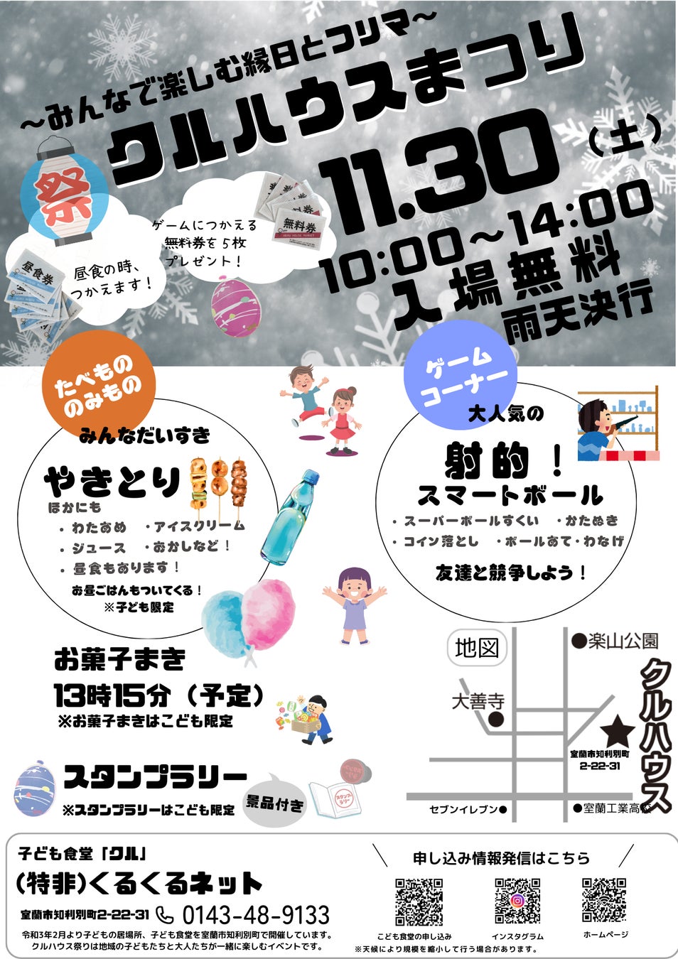 特定非営利活動法人くるくるネット(所在地:北海道室蘭市知利別町2-22-31)は、2024年11月30日(土)に地域交流イベント「クルハウス祭り」を開催いたします。室蘭市のクルハウスで行われるこのイベントは、子どもから大人まで、地域の皆さまが楽しめる内容を盛りだくさんでご用意しております。入場は無料で、雨天決行ですので、ぜひご参加ください!