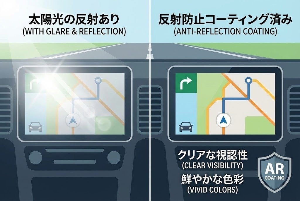 外光の映り込みを抑える「アンチグレア(AG)」処理と、光の反射を低減する「アンチリフレクション(AR)」処理を組み合わせたダブル加工を施しました。直射日光が当たる環境下でも画面の白飛びを抑え、くっきりとした視界を確保します。
