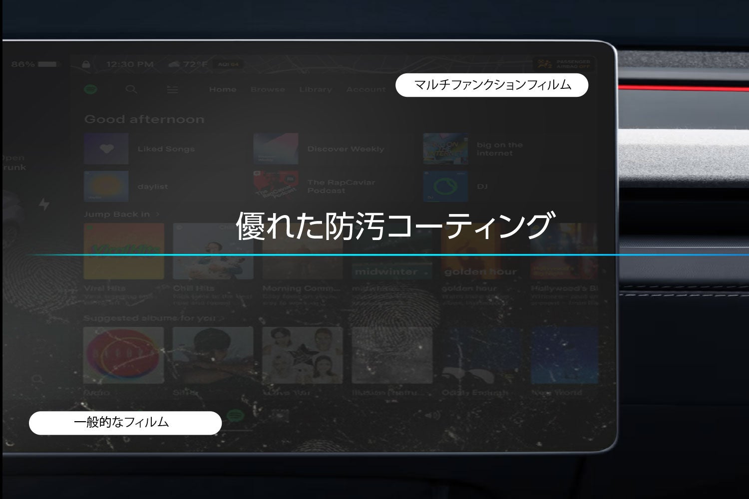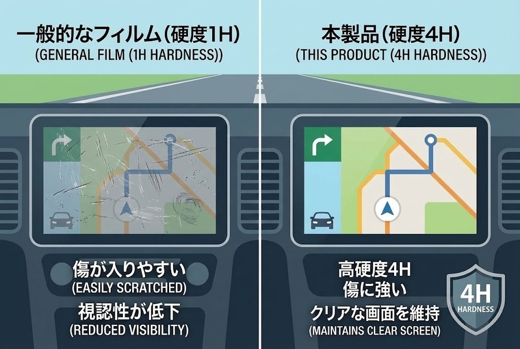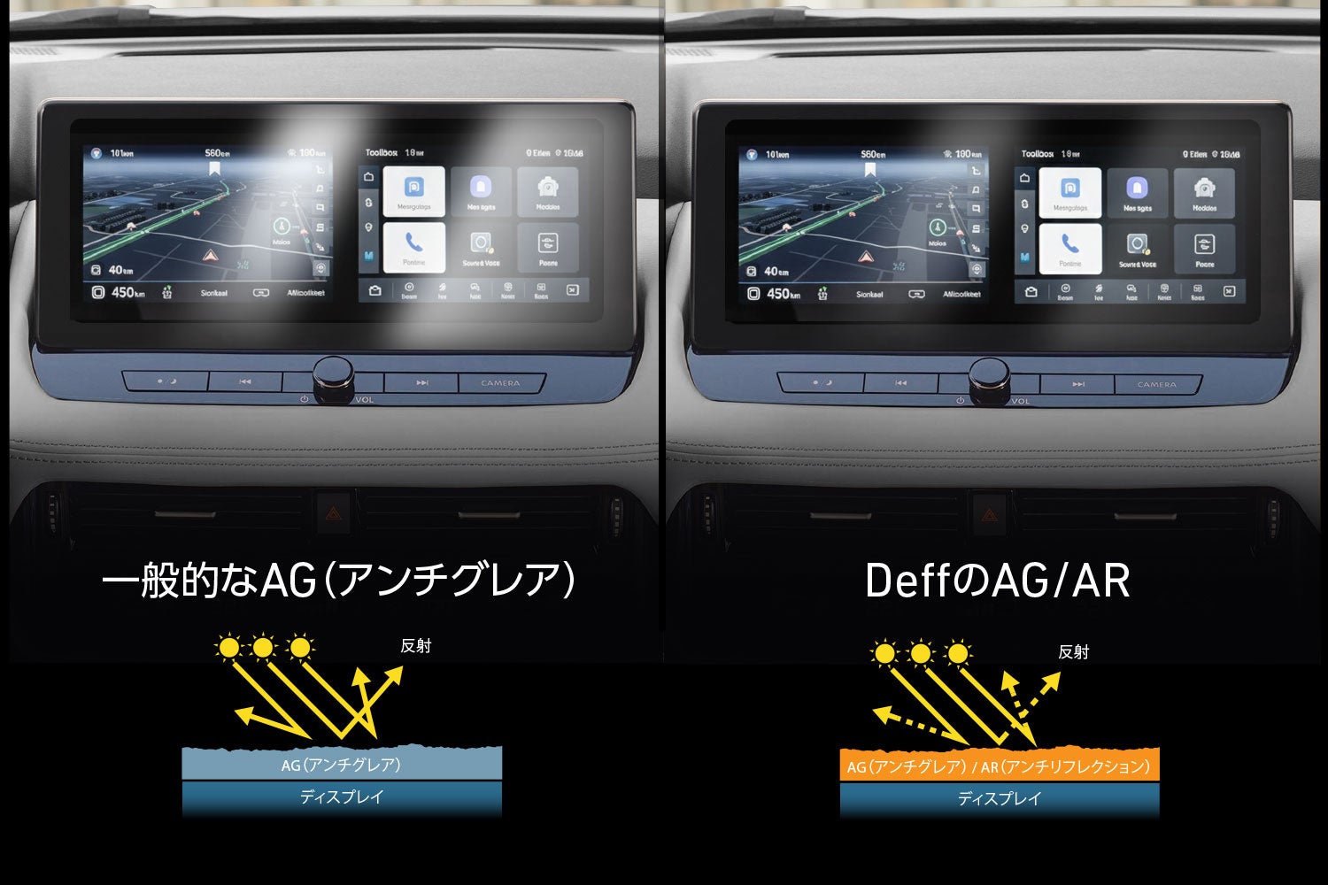 昨今の自動車はディスプレイの大型化・高精細化が進んでいますが、それに伴い「日中の日差しが反射して画面が見にくい」「タッチ操作による指紋汚れが目立つ」といった悩みも増えています。 ディーフはスマートフォン用保護フィルムで長年培った技術を応用し、車載ディスプレイに特化した高機能フィルム「Multifunction Screen Protector」を開発しました。