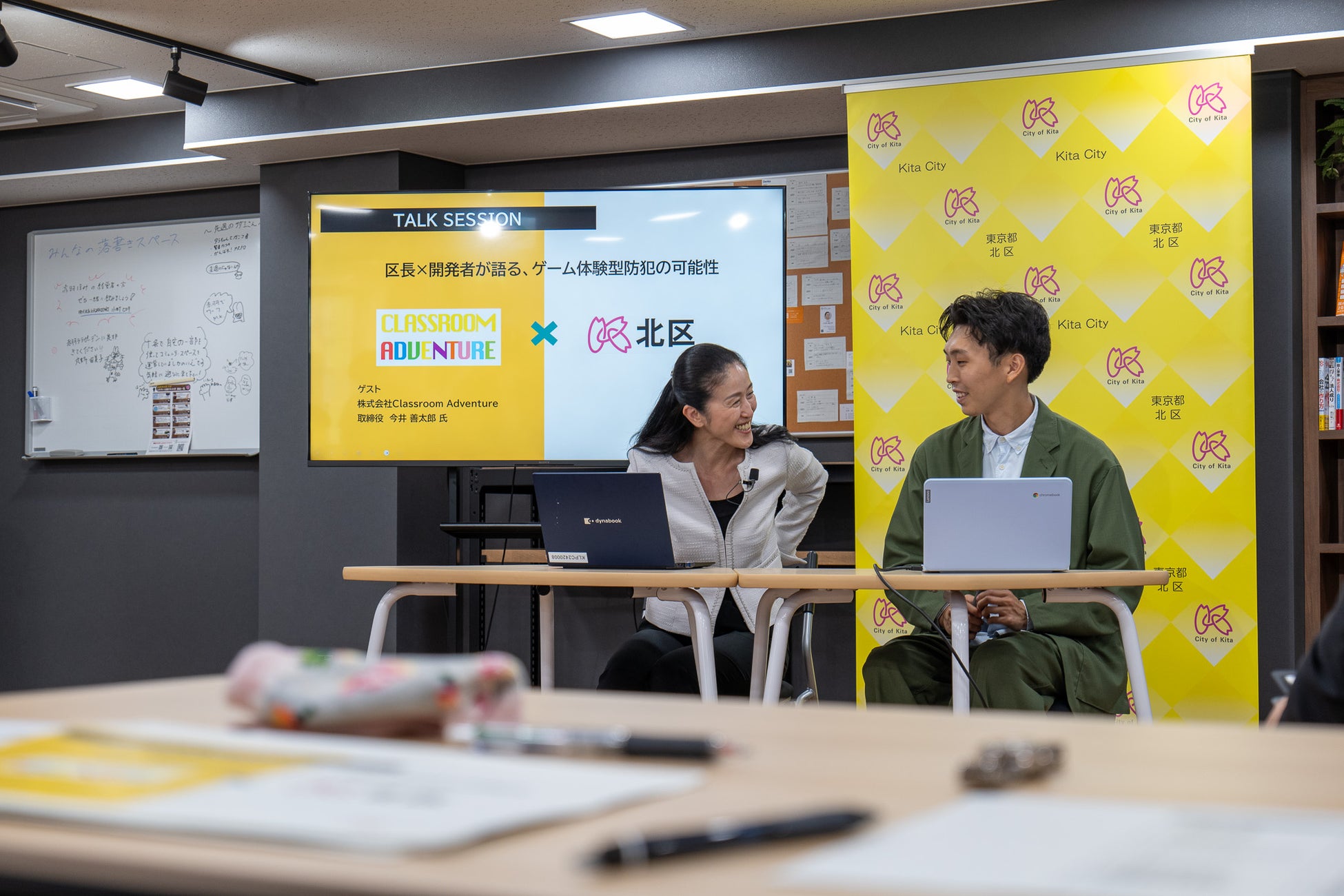 導入に先駆け、北区のやまだ加奈子区長とClassroom Adventureの代表今井で記者会見を行いました。