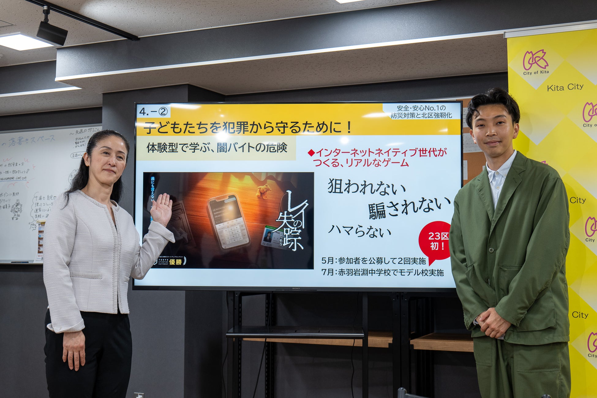 東京都北区では「子どもの幸せNo.1」を掲げ、社会全体で子ども・若者を育て見守る仕組みの構築に全力で取り組んでいます。特に社会課題となっているインターネットリテラシー向上は、インターネットネイティブの子ども・若者の当事者目線である若い人たちの力と連携し、実践的に対応することが最も効果的だと考えます。今回、その大きな課題のひとつである、「闇バイト」を入口とする犯罪に巻き込まれないための「若年層の犯罪加担防止」にClassroom Adventure様と連携し、「レイの失踪」プログラムのリアルな体験学習機会を提供することになりました。ネット上の危険情報に対する子ども・若者の意識向上を図り、闇バイト問題から守ってまいります。