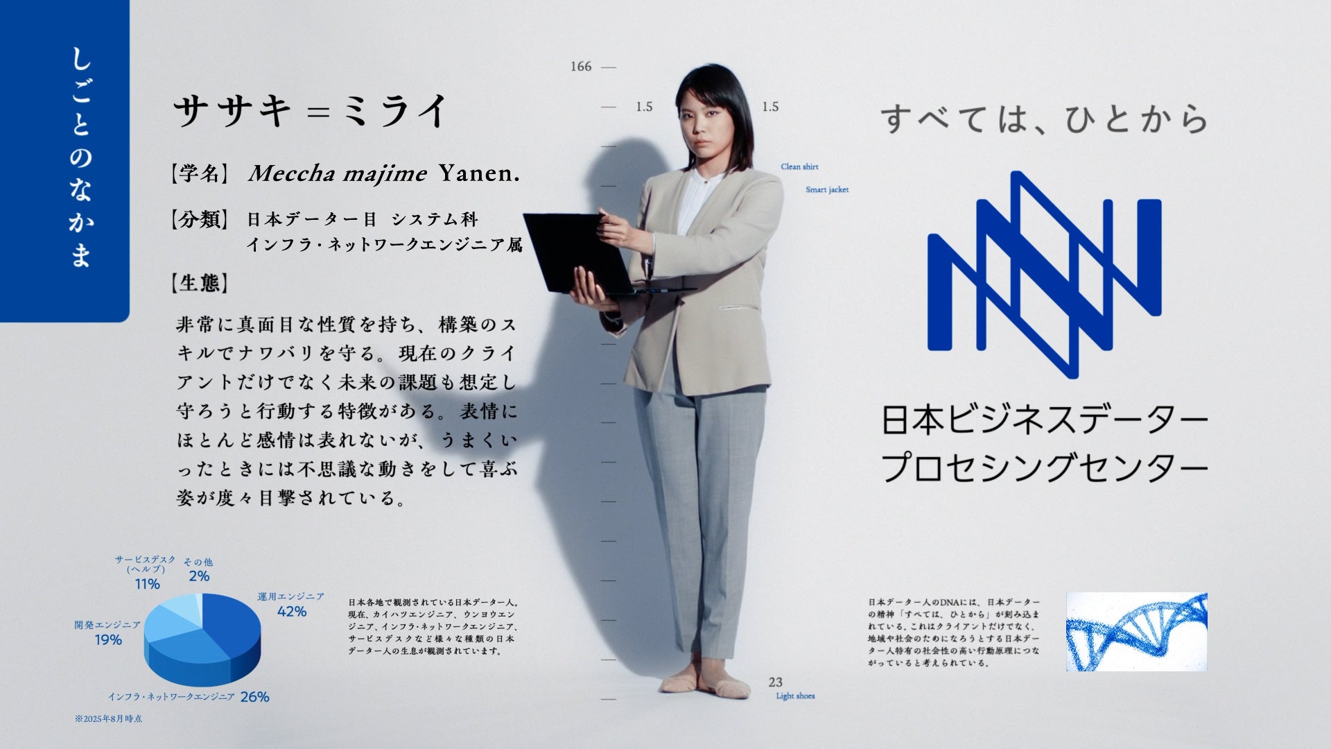株式会社日本ビジネスデータープロセシングセンター(本社:兵庫県神戸市、代表取締役社長:池智太郎、以下「日本データー」)は、社員=「日本データー人」の日常を描いた新CM【IT事業 開発篇】【IT事業 インフラ篇】(各15秒)を公開しました。博士とアナウンサーがドキュメンタリー番組風に解説する構成で、社会を支えるエンジニア像をユニークに表現しています。