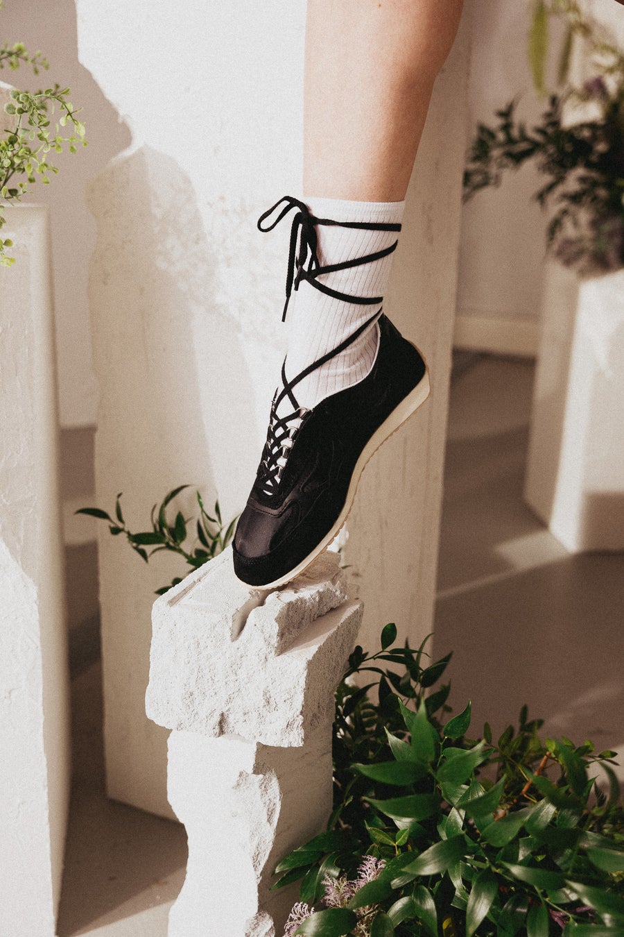 シューレースを足首に結ぶバレエシューズのような遊び心のあるデザインで、春夏の足元を軽くしてくれる。※日本での販売は短いシューレースの付属あり