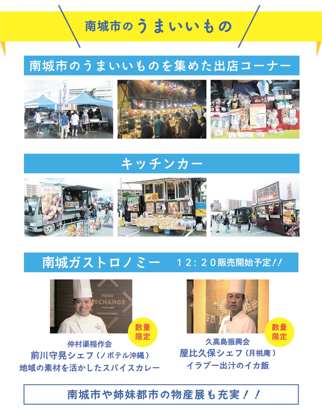 出店エリアでは、「第10回全国ハーブサミット南城大会」の一環として行われるマルシェ&体験ブース、「南城セレクション」などを取り揃える南城市商工会まつり、県内で活躍するプロのシェフと地域食材のコラボレーション、姉妹都市の物産販売など、多数の展示企画が用意されています。