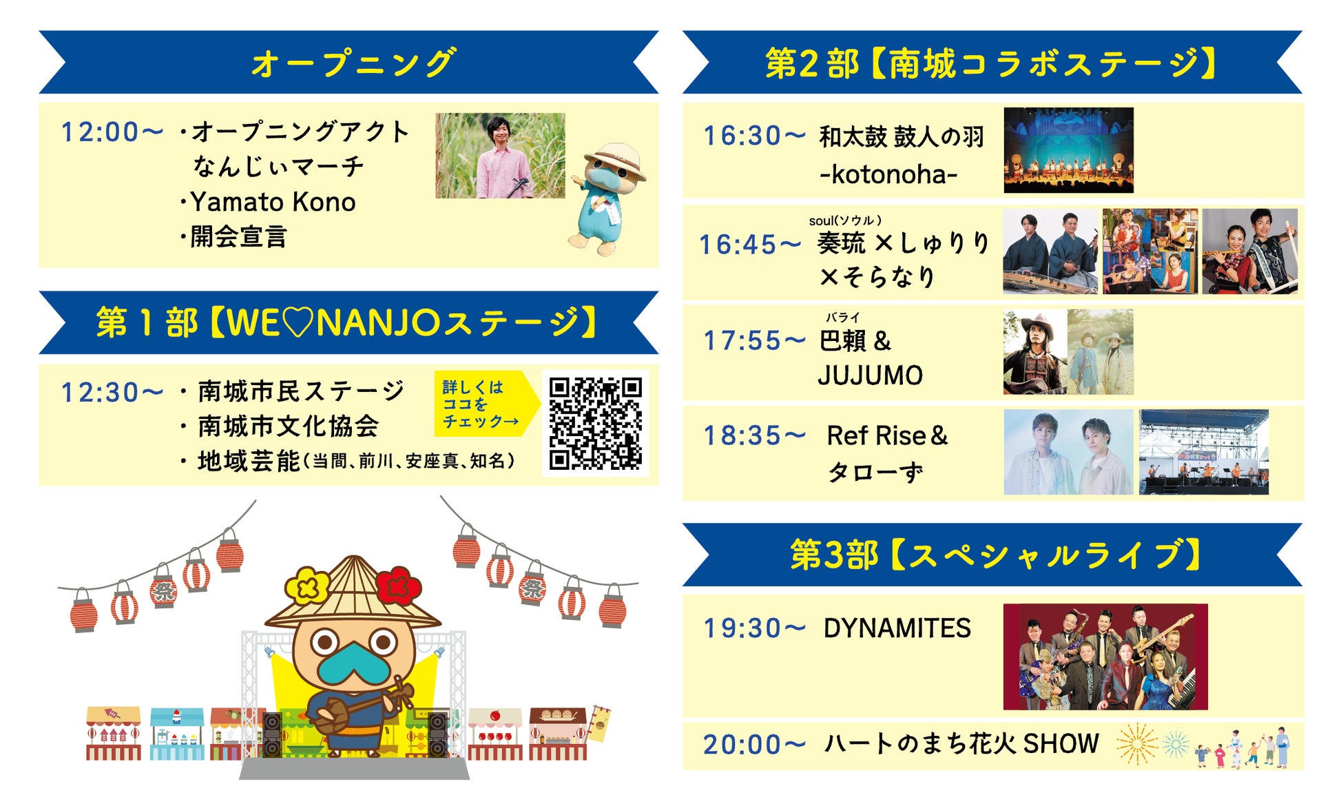 ステージイベントでは、市内アーティストと子どもたちのコラボレーション、南城市民によるダンスや地域芸能、南城市ゆかりのアーティストたちの豪華共演、DYNAMITESによるスペシャルライブも予定されています。