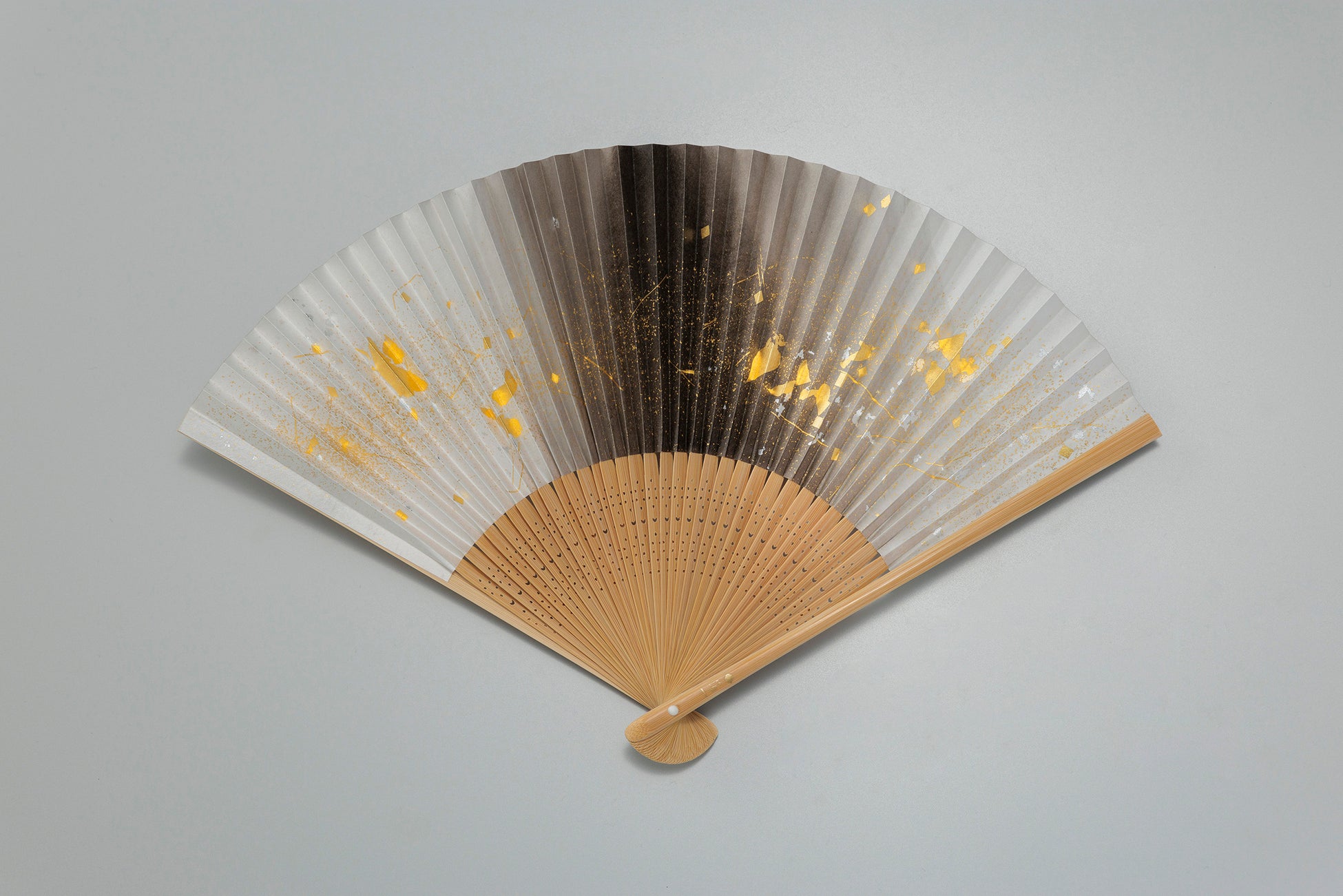 この扇子は、そうした等伯の表現を現代に映したものです。和紙の上に繊細な墨のグラデーションを施し、無限に広がるような奥行を感じさせる扇面に仕上げました。この「ぼかし」はすべて職人の手作業によるもの。和紙と墨、そして熟練の技が重なり合うことでのみ生まれる、幽玄の美がそこにあります。さらに、控えめに散らされた金箔が、あおぐたびに仄かに光を放ち、静かな中に華やぎを添えます。