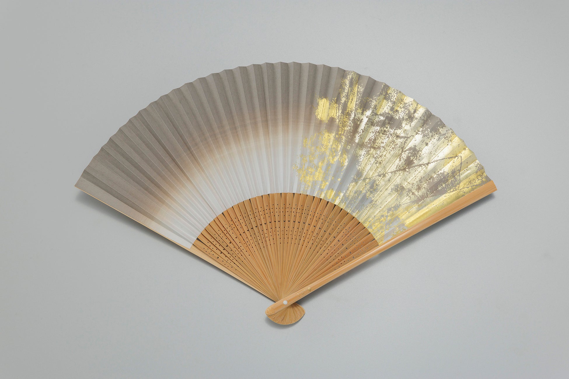 三歩色とシャンパンゴールド、異なる色調の金箔を重ね合わせることで、上品な光沢と奥行きを生み出しました。背景には和の伝統色「白茶」のグラデーションを用い、扇骨の竹の色とも美しく調和。控えめながらも洗練された華やかさを纏う、静謐な一品です。