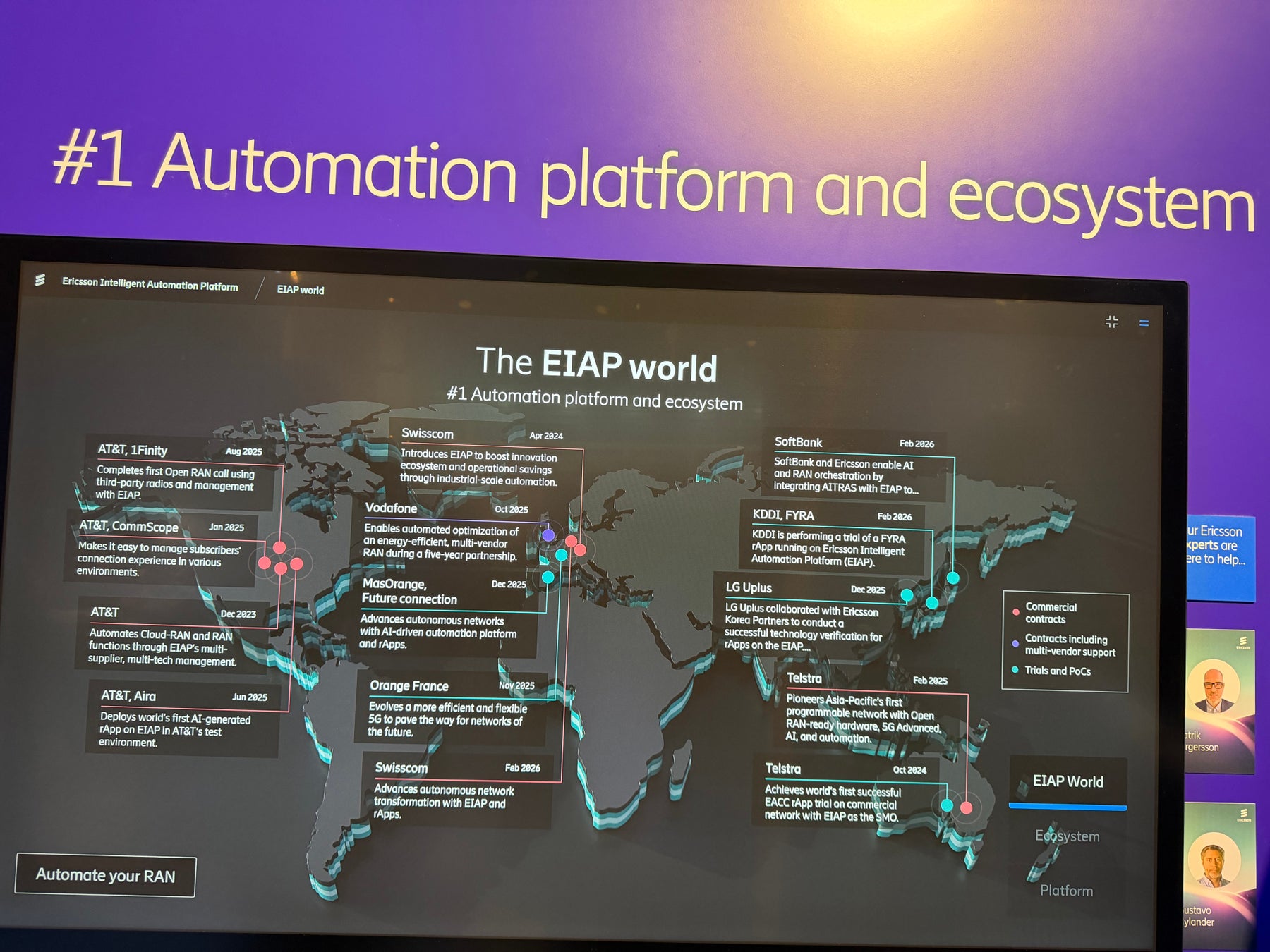 Ericssonブース内のモニターでは、Ericsson Intelligent Automation Platform(EIAP)の事例の一つとして、KDDIによるFYRA rAppのトライアルが取り上げられました。