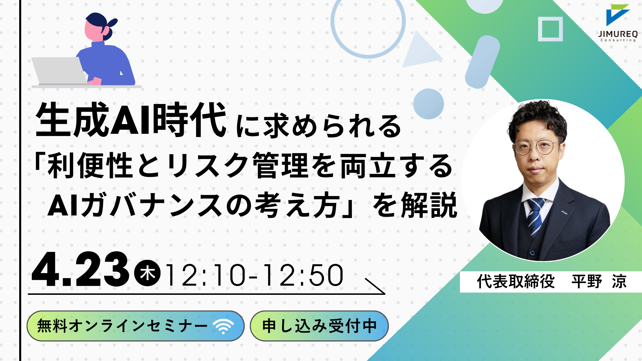 【4/23 12:10よりWebセミナー開催】JIMUREQ Consulting、生成AI時代に求められる「利便性とリスク管理を両立するAIガバナンスの考え方」を解説