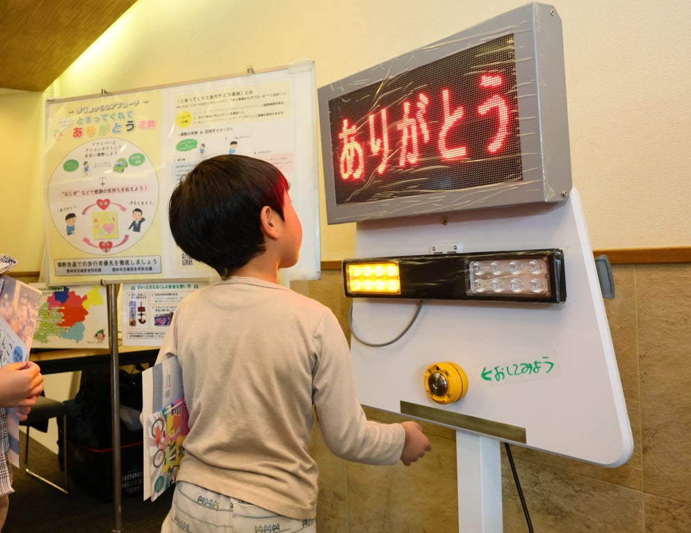 また、豊田市は、市の交通安全施策として、歩行者優先を呼びかける啓発活動(「とまってくれてありがとう運動」)の紹介や、設置を進める押しボタン式横断者明示標識(製品名:「ぴかっとわたるくん」)のデモ機の展示等を行い、トヨタ自動車も、市と協力して進める自転車のヘルメット着用等に関する啓発を実施しました。