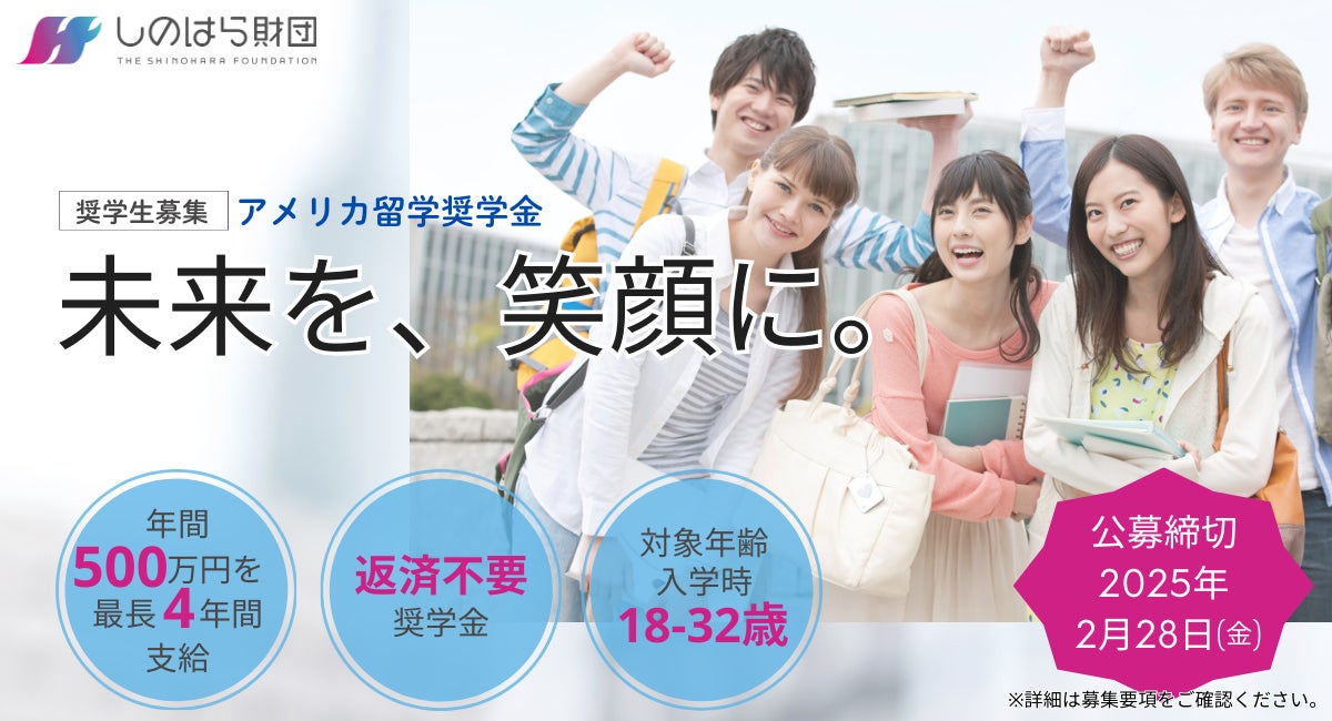 一般財団法人篠原欣子記念財団(所在地:東京都新宿区、代表理事:篠原よしみ、以下「しのはら財団」)は新たに、アメリカ留学支援のための給付型奨学金プログラムを2024年12月10日より開始いたします。