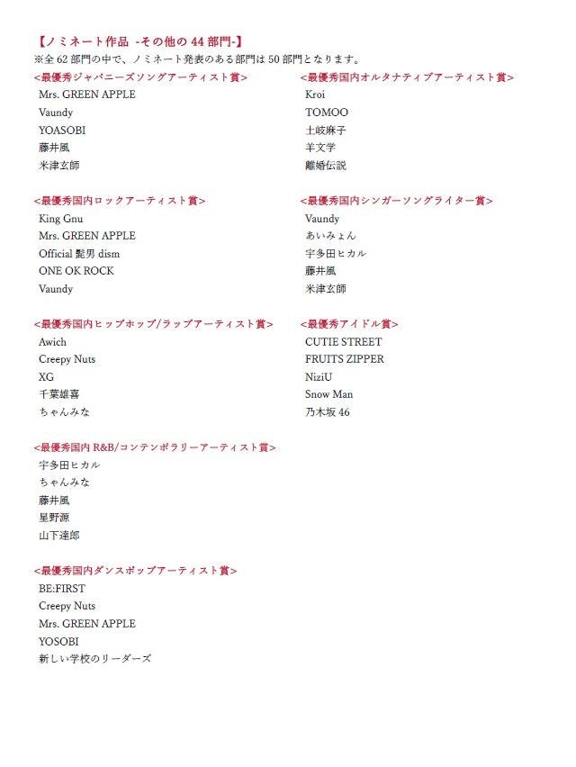 ※全62部門の中で、ノミネート発表のある部門は50部門となります。