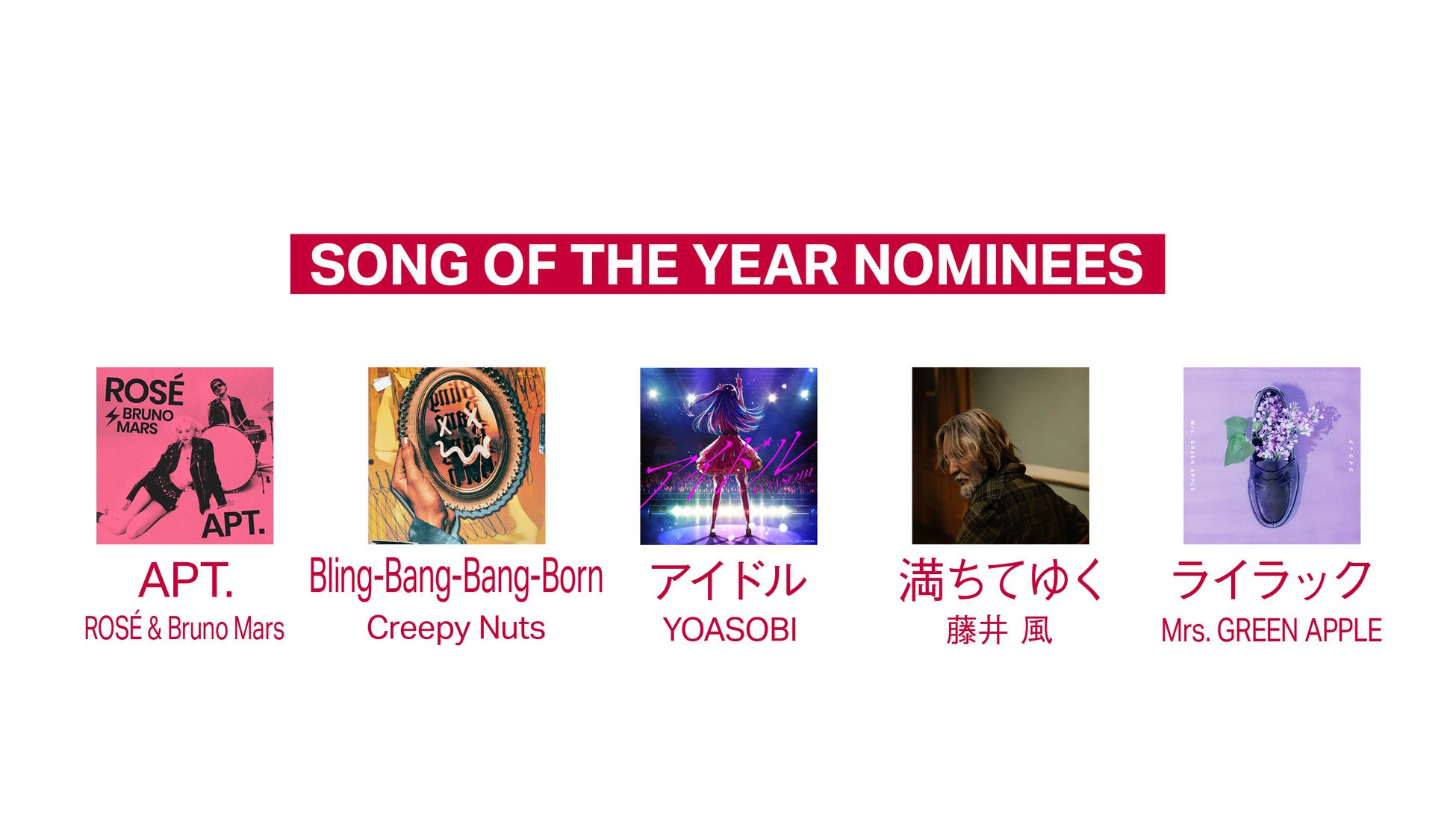 主要6部門では、最優秀楽曲賞256曲、最優秀アーティスト賞167アーティスト、最優秀アルバム賞171作品、最優秀ニュー・アーティスト賞61アーティスト、Top Global Hit from Japan100曲、最優秀アジア楽曲賞24曲の中から、各部門5つずつのノミネート作品/アーティストが決定しました。エントリー作品に選ばれたアーティスト・クリエイターをはじめとする音楽関係者によってノミネート作品の中から最優秀作品を決定する最終投票も、いよいよ本日より開始いたします。最優秀作品の決定まで、どうぞご期待ください。