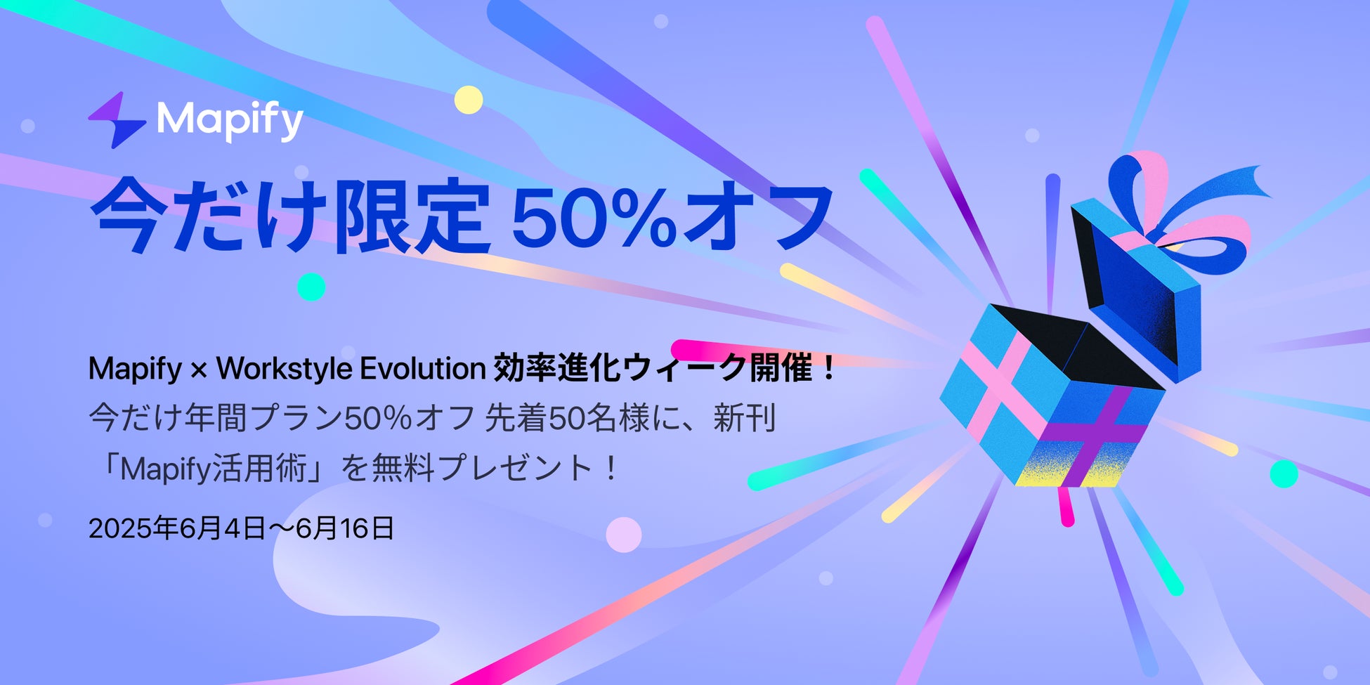 これを記念して、2025年6月上旬より、年間プラン50%オフの期間限定キャンペーンを開催予定です。さらに、数量限定で「Mapify活用術」書籍のプレゼントもご用意しています。ぜひこの機会に、進化したMapifyをお試しください。