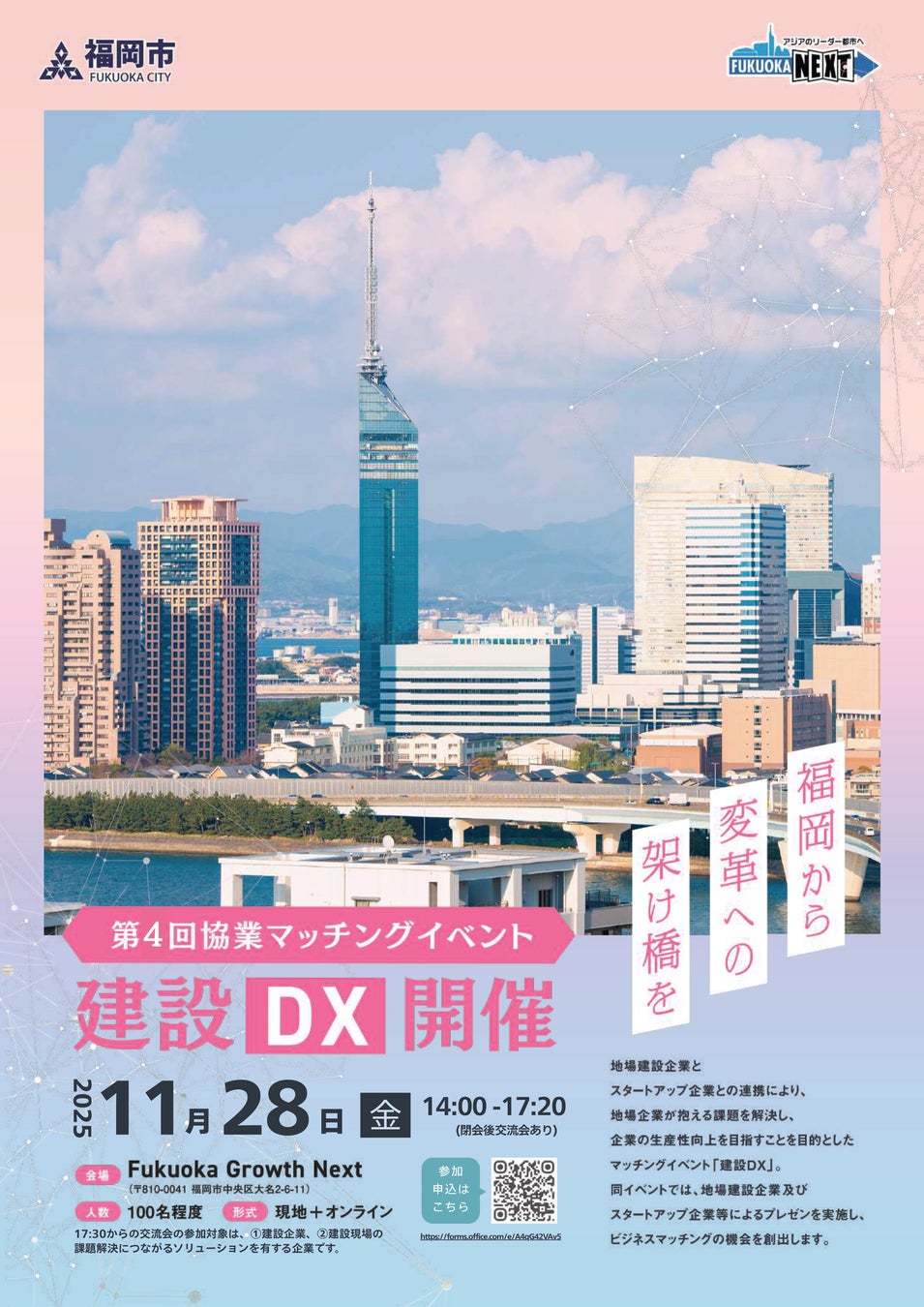 福岡市道路下水道局では、建設業界の生産性向上に向けた取組み等を支援するため、地場建設企業とスタートアップ企業等との連携機会を創出すべく、「第4回 協業マッチングイベント『建設DX』」を開催します。