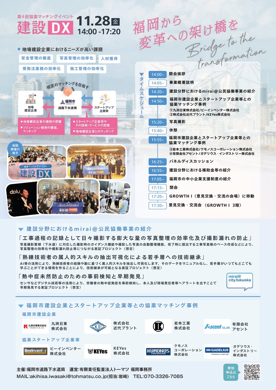 本イベントでは、福岡市実証事業の紹介のほか、地場建設企業とスタートアップ企業等との協業マッチング事例の発信等を行います。