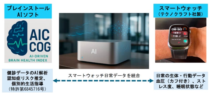 AI-BoxにプレインストールされているAIソフト「AICOG」は、健診データのAI解析、認知症リスク推定、個別的生活指導を行います。一方、スマートウォッチが日常の生体・行動データ、血圧(超小型カフ付き)、ストレス度、睡眠状態などを測定。AI-Boxは、これらのAICOGによる解析データとスマートウォッチから取得した日常データを統合し、介護記録の自動作成、利用者への応対支援等を通じて介護スタッフの業務負荷を軽減します。