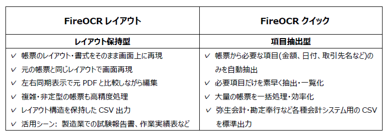 お客様のニーズに合わせて2種類のサービスをご用意しています。「帳票の詳細確認」には「FireOCRレイアウト」、「必要なデータの素早い抽出」には「FireOCRクイック」と、それぞれのニーズに最適化されたソリューションです。