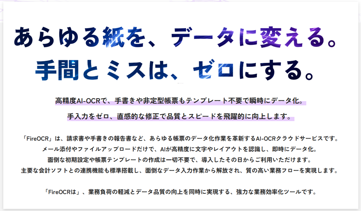 これらの課題により、貴重な従業員の時間が非効率な単純作業に費やされているのが現状です。「FireOCR」は、こうした課題を解決するために開発された初期設定不要で即日利用可能な次世代AI-OCRソリューションです。