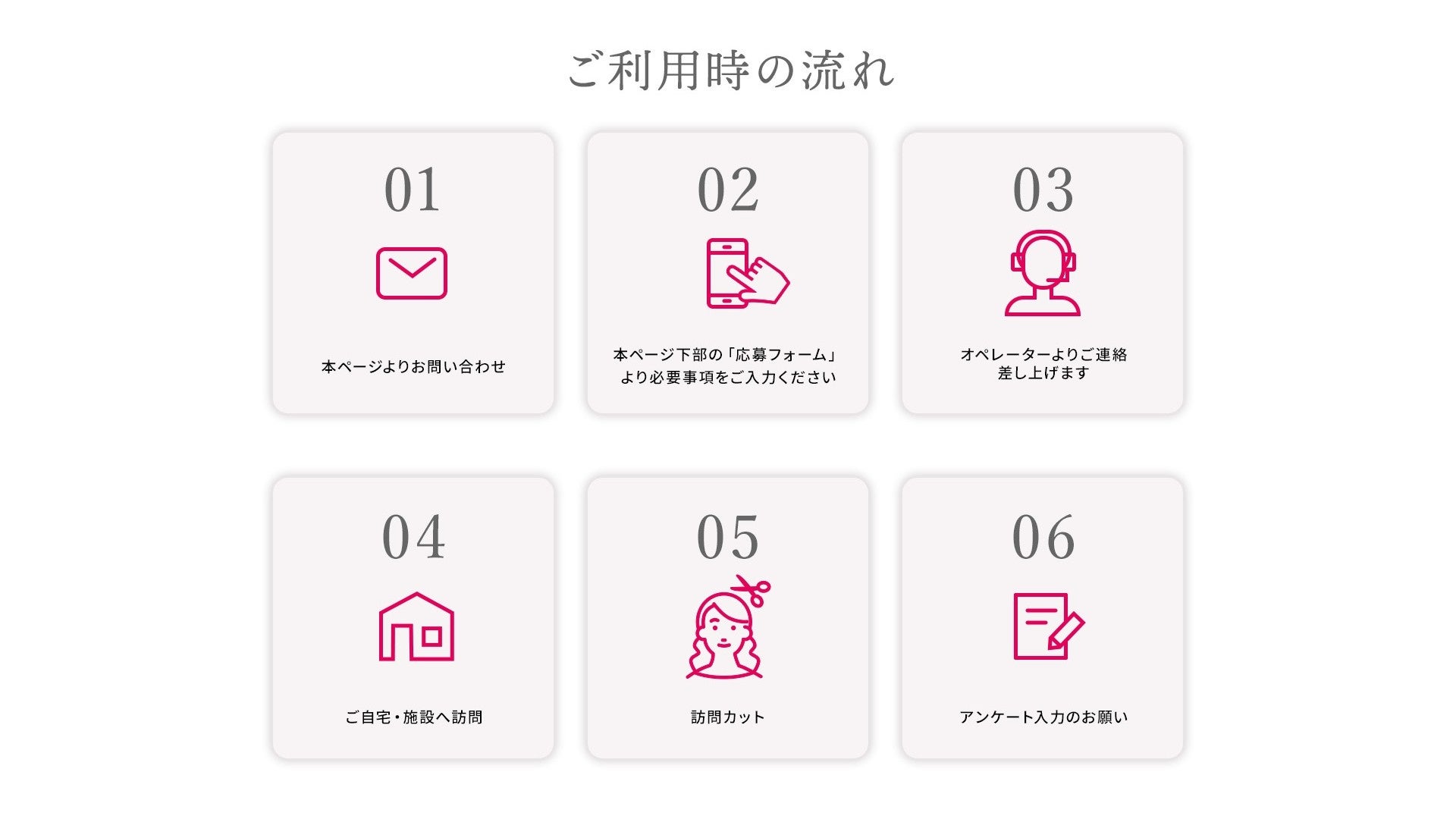 訪問カットに加えて、お顔のお手入れ・フェイスパック・ハンドケアの中から1つ、お好きなオプションを無料でお選びいただけます。「新しい年を、気持ちよく迎えてほしい」そんな想いを込めた特別なキャンペーンをご用意いたしました。