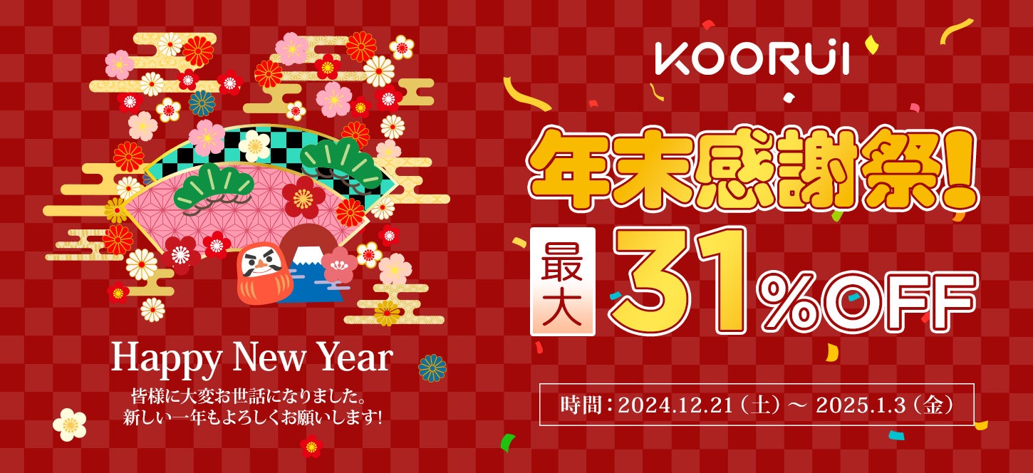 KOORUIでは、お客様への感謝の気持ちを込めて、Amazonにて年末感謝キャンペーンを実施中です。割引率は最大31%オフ!一年のご愛顧に心より感謝申し上げ、これからもよろしくお願いいたします!私たちはより良い商品とサービスをご提供できるよう、引き続き努力してまいります。