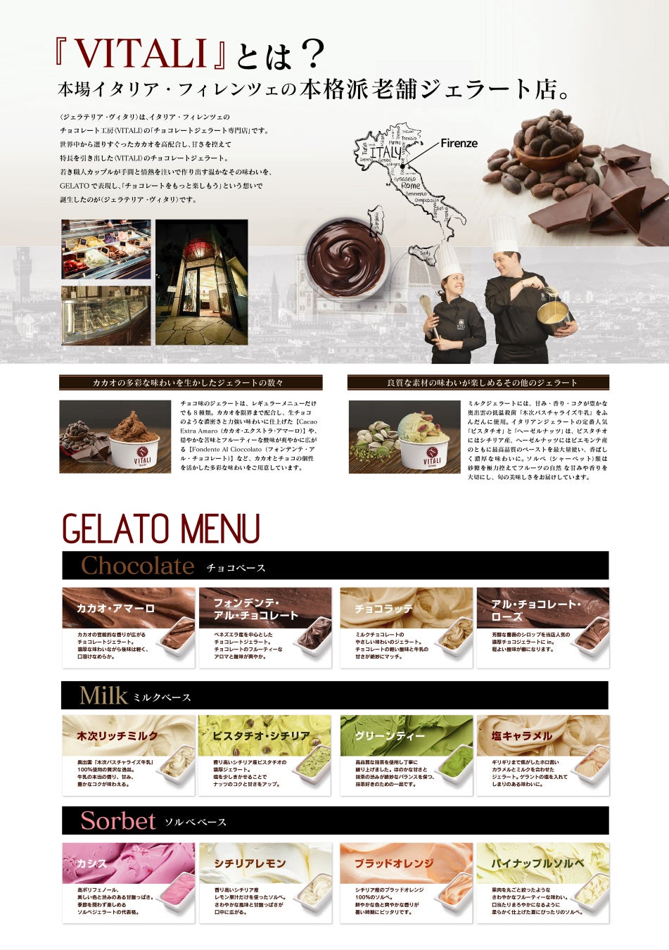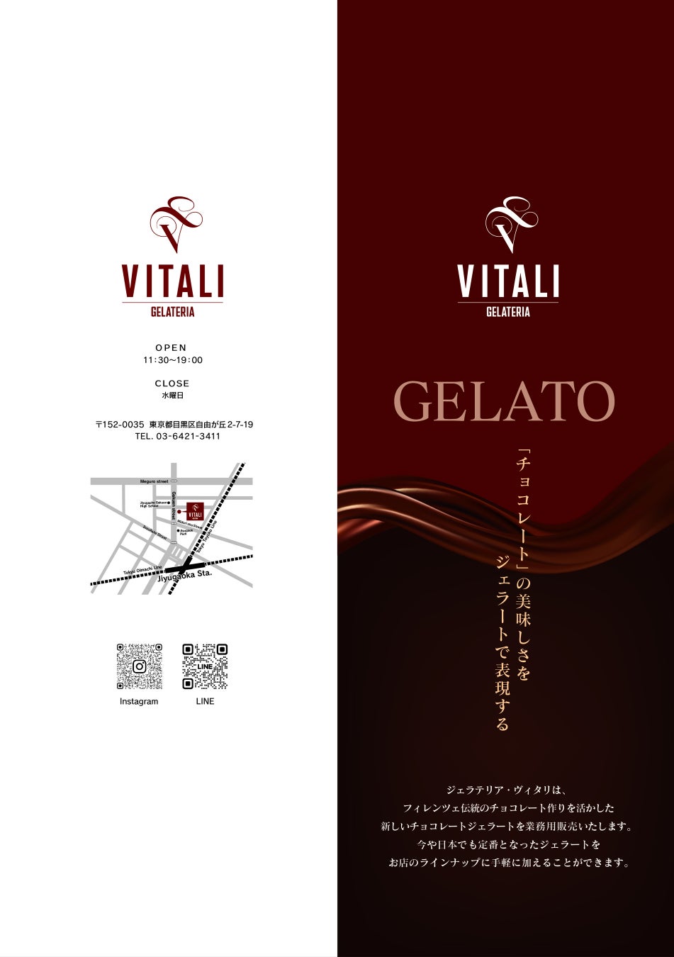 ジェラテリア・ヴィタリは、イタリア・フィレンツェのチョコレート工房〈VITALI〉の日本1号店となる自由が丘の「ジェラート専門店」です。 世界中から選りすぐったカカオを高配合し、甘さを控えて特長を引き出した〈VITALI〉のチョコレート。 若き職人カップルが手間と情熱を注いで作り出す温かなその味わいをGELATOで表現し「チョコレートをもっと楽しもう」という想いで誕生したのがジェラテリア・ヴィタリです。チョコレート味のジェラートは、レギュラーメニューだけでも8種類。 カカオを限界まで配合し、生チョコのような濃密さと力強い味わいに仕上げた「カカオ・エクストラ・アマーロ」や、穏やかな苦味とフルーティーな酸味が爽やかに広がる「フォンデンテ・アル・チョコレート」など、カカオとチョコの個性を活かした奥深いジェラートをご用意しています。