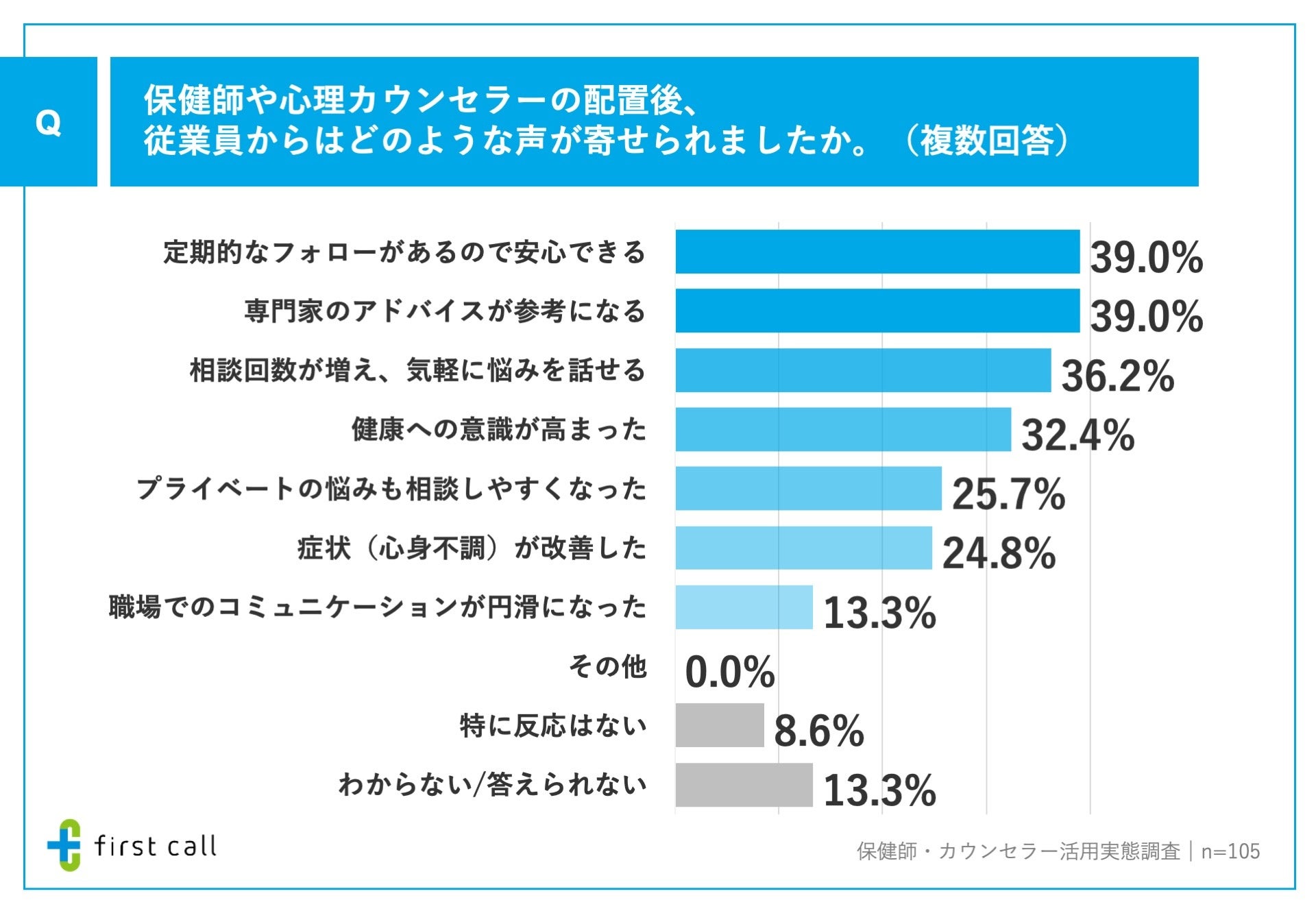 加えて、「保健師や心理カウンセラーの配置後、従業員から寄せられた声」を調査したところ、「定期的なフォローがあるので安心できる」が39.0%、「専門家のアドバイスが参考になる」が39.0%、「相談回数が増え、気軽に悩みを話せる」が36.2%となりました。