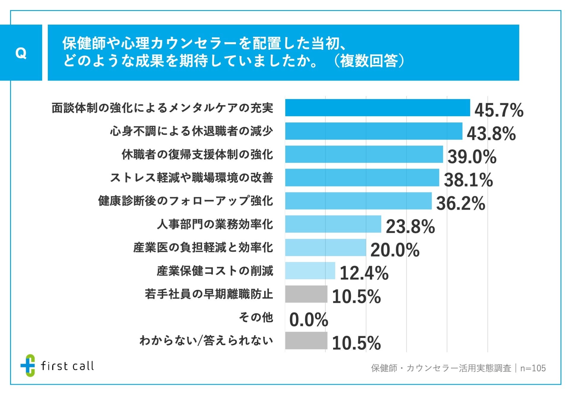 次に、「保健師や心理カウンセラーを配置した当初、期待していた成果」について調査したところ、「面談体制の強化によるメンタルケアの充実」が45.7%、「心身不調による休退職者の減少」が43.8%、「休職者の復帰支援体制の強化」が39.0%となりました。