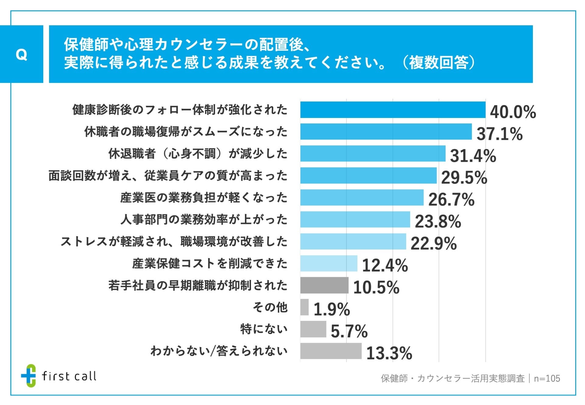 続いて、「保健師や心理カウンセラーの配置後、実際に得られたと感じる成果」を調査したところ、「健康診断後のフォロー体制が強化された」が40.0%、「休職者の職場復帰がスムーズになった」が37.1%、「休退職者(心身不調)が減少した」が31.4%となりました。