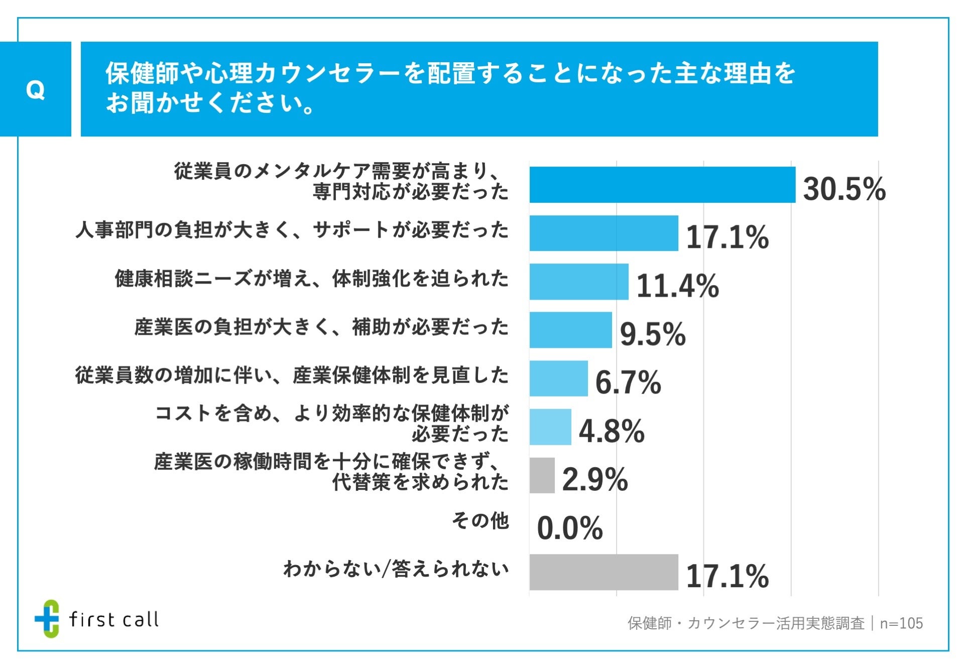 はじめに、「保健師や心理カウンセラーを配置することになった主な理由」について調査したところ、「従業員のメンタルケア需要が高まり、専門対応が必要だった」が30.5%、「人事部門の負担が大きく、サポートが必要だった」が17.1%、「健康相談ニーズが増え、体制強化を迫られた」が11.4%となりました。