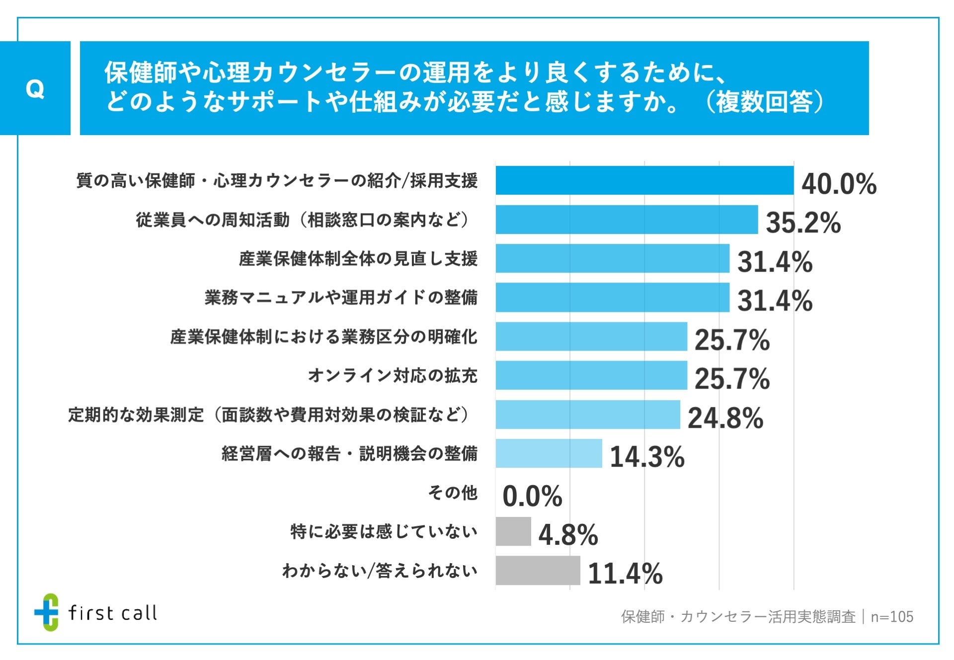 最後に、「保健師や心理カウンセラーの運用をより良くするために必要なサポートや仕組み」について調査したところ、「質の高い保健師・心理カウンセラーの紹介/採用支援」が40.0%、「従業員への周知活動(相談窓口の案内など)」が35.2%となりました。