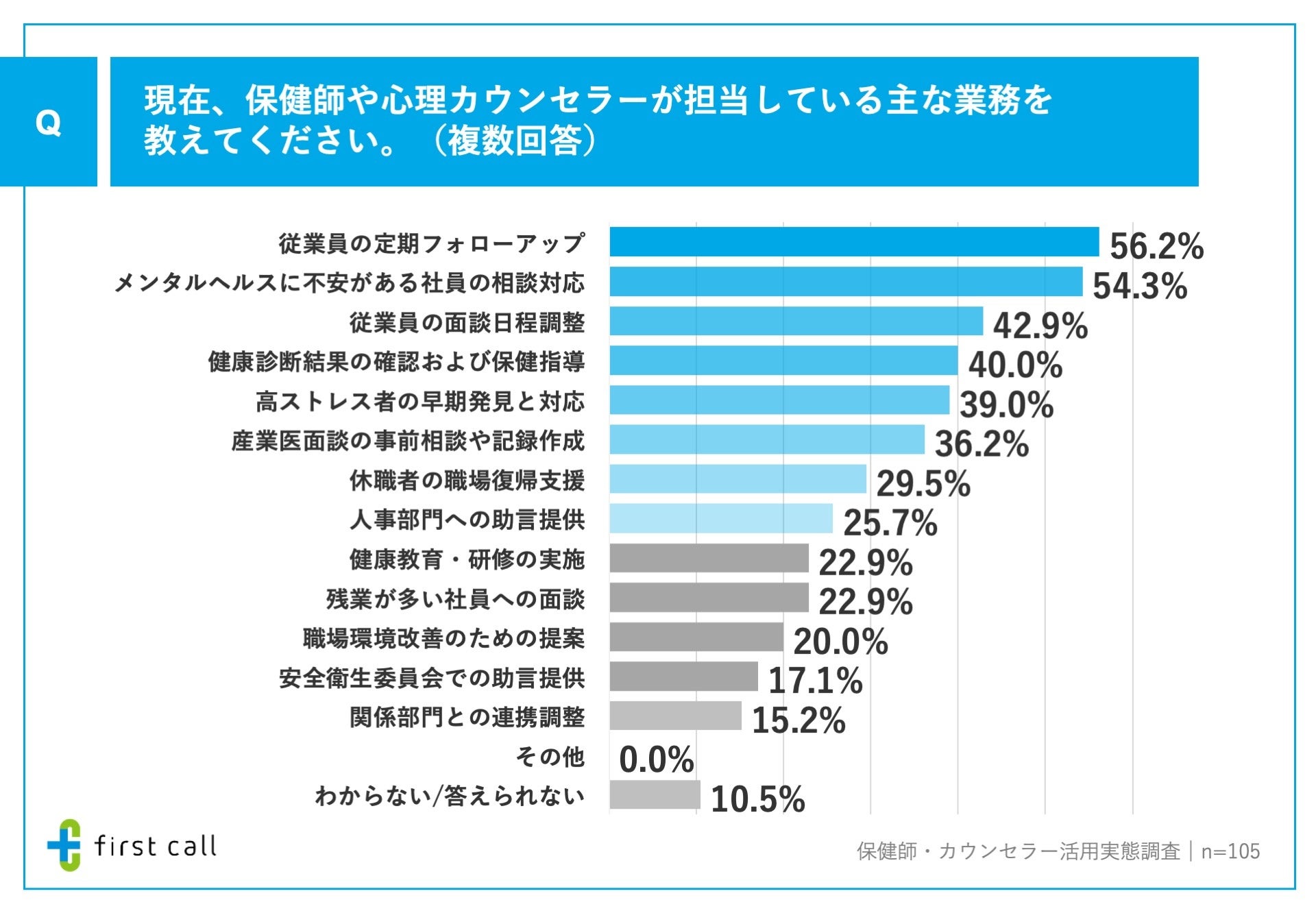 また、「保健師や心理カウンセラーの主な担当業務」を調査したところ、「従業員の定期フォローアップ」が56.2%、「メンタルヘルスに不安がある社員の相談対応」が54.3%、「従業員の面談日程調整」が42.9%となりました。