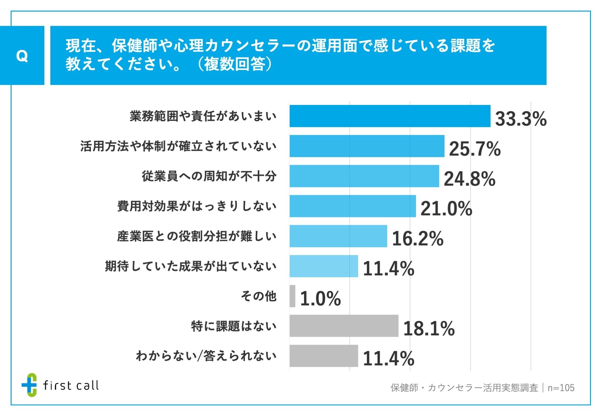 さらに、「保健師や心理カウンセラーの運用面で感じている課題」について調査したところ、「業務範囲や責任があいまい」が33.3%、「活用方法や体制が確立されていない」が25.7%、「従業員への周知が不十分」が24.8%となりました。