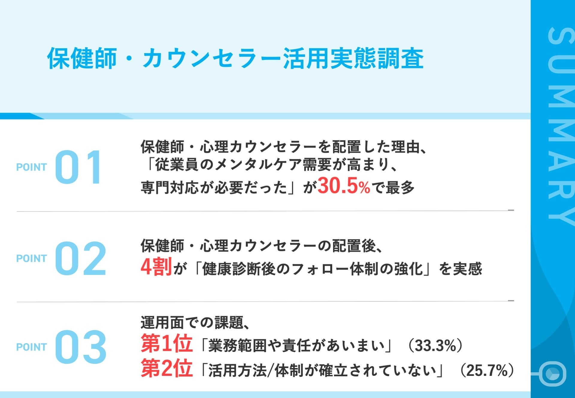 4割の企業が保健師・心理カウンセラー配置の効果を実感! 一方、「業務範囲や責任のあいまいさ」など運用面では課題も散見
