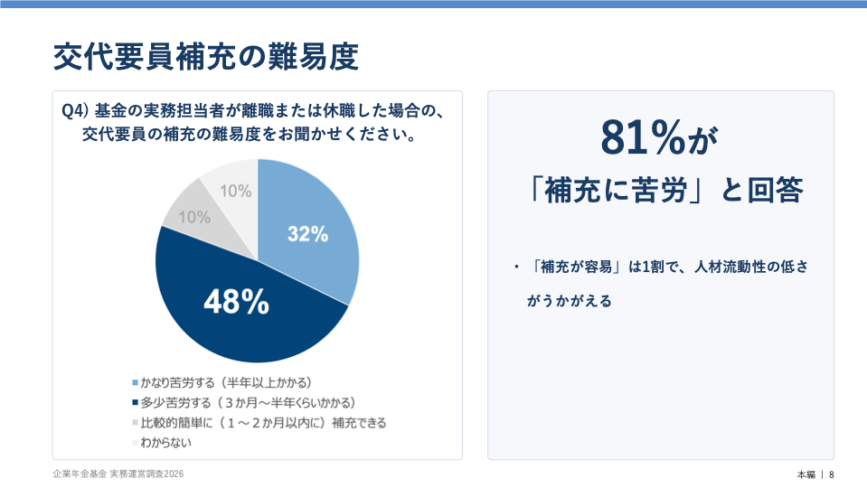 企業年金基金の81%が、担当者の離職・休職時の補充について「苦労する」と回答しました。