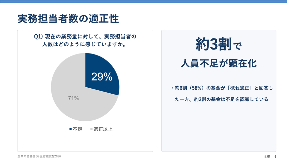 本調査の結果、企業年金基金の実務運営は、平均実務担当者数1.8人という極めて少人数の体制で支えられており、約3割が人員不足を認識、さらに8割以上が「交代要員の補充に苦労する」と回答しました。