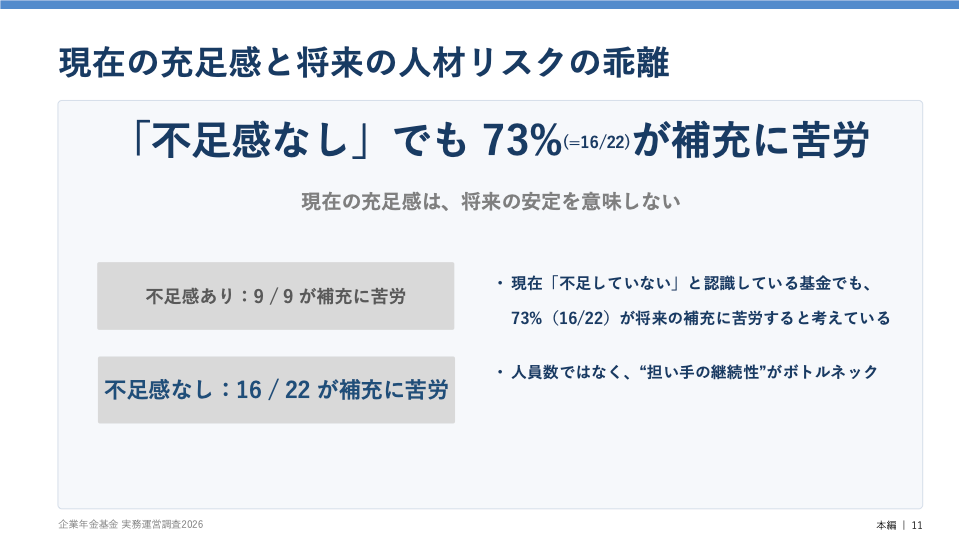 現在は人員が足りていると認識している基金であっても、73%が将来の人材補充に課題を抱えていることが明らかとなりました。