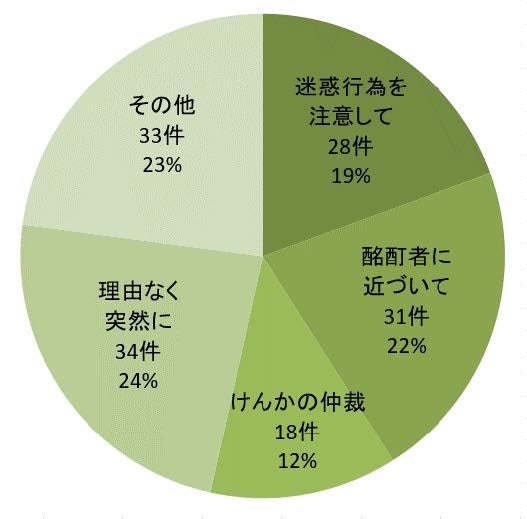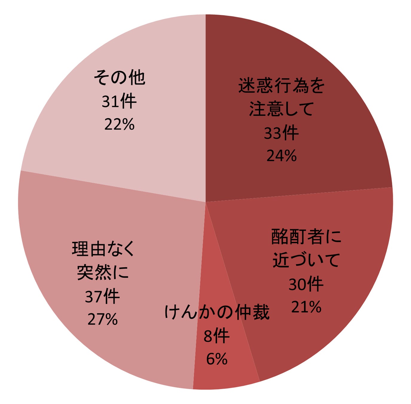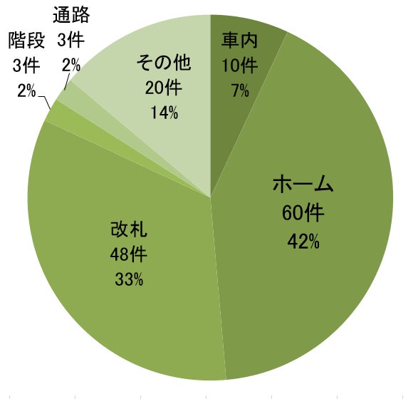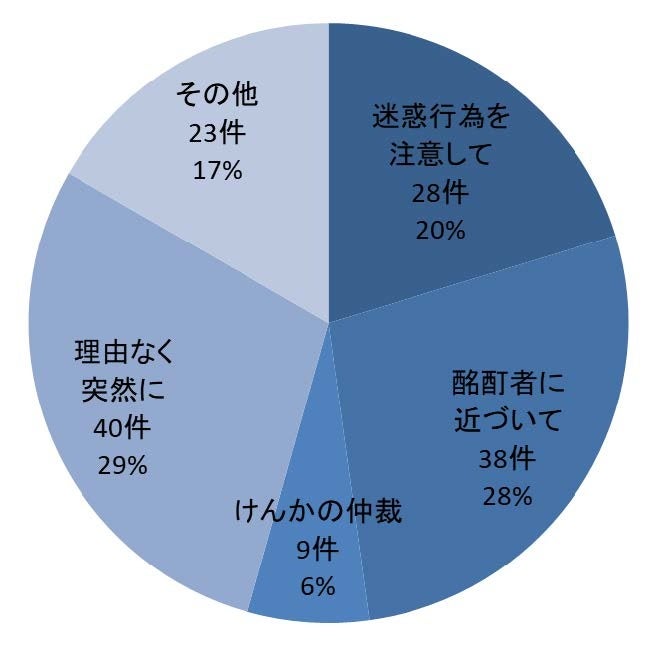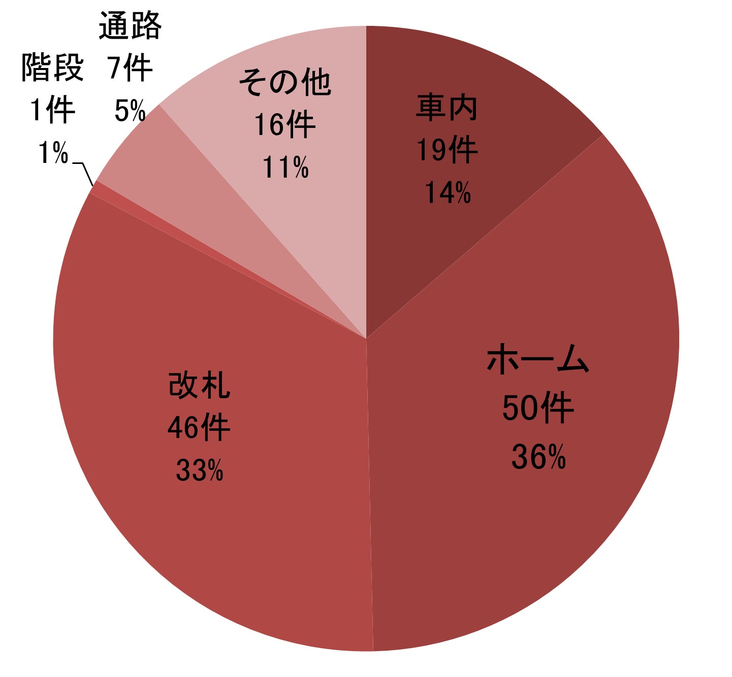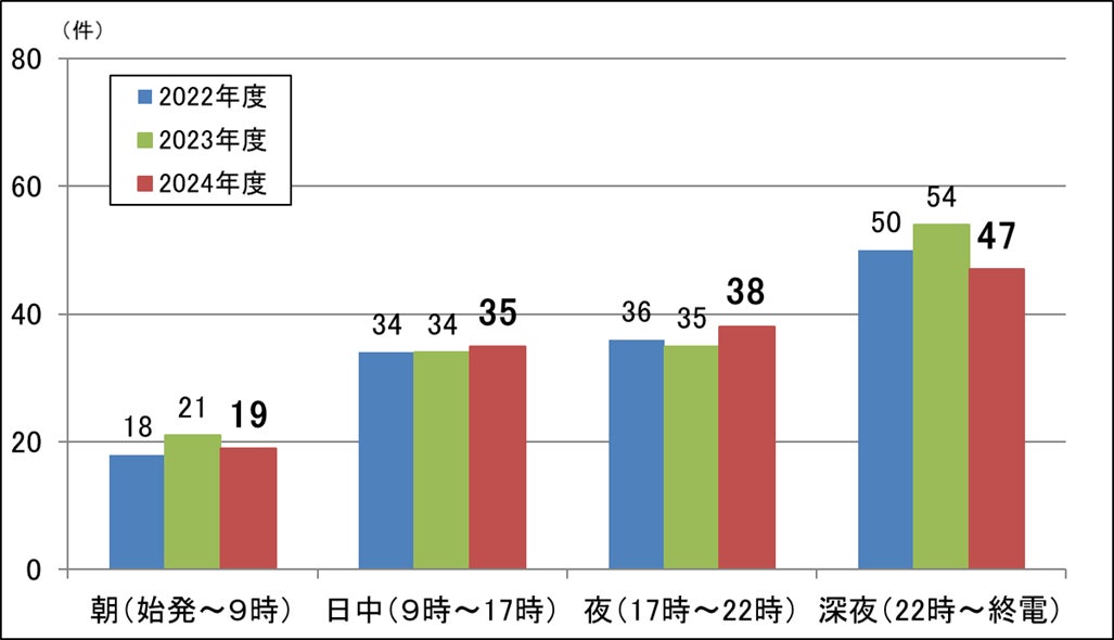 暴力行為が発生する状況としては、理由もなく突然に暴力を振るわれるケースや、迷惑行為を注意した際の発生が多く、時間帯については深夜帯(22時以降)に多く発生しています。また、加害者年齢は幅広い年代に分布しており、飲酒している場合が多いことが見受けられます。犯罪である暴力行為をなくし、安全で快適な鉄道を維持するため、当協会では引き続き啓発ポスターの掲出など各種の取り組みを実施してまいります。