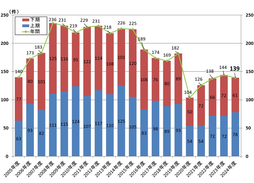 2024年度の発生件数は、上期に昨年度比で6件増加したものの下期には11件減少し、年度の総件数では5件の減少となりました。一方、一昨年度との比較では横ばいであり、2020年に発生した新型コロナウイルス感染症の流行以降では、引き続き高水準で推移しています。