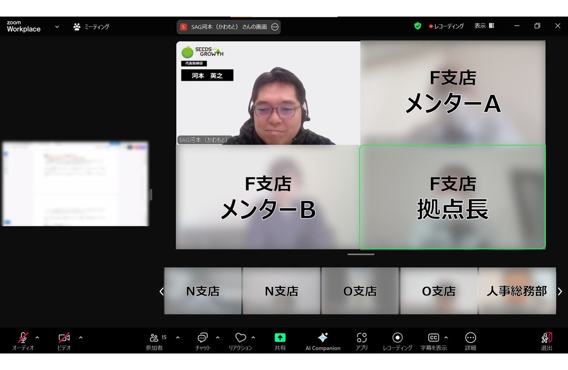 ●全国の拠点にメンターがいるため、3拠点ずつ毎月オンラインにて定例会を実施。メンターの上司や、本部の人事総務部も定例会に参加。