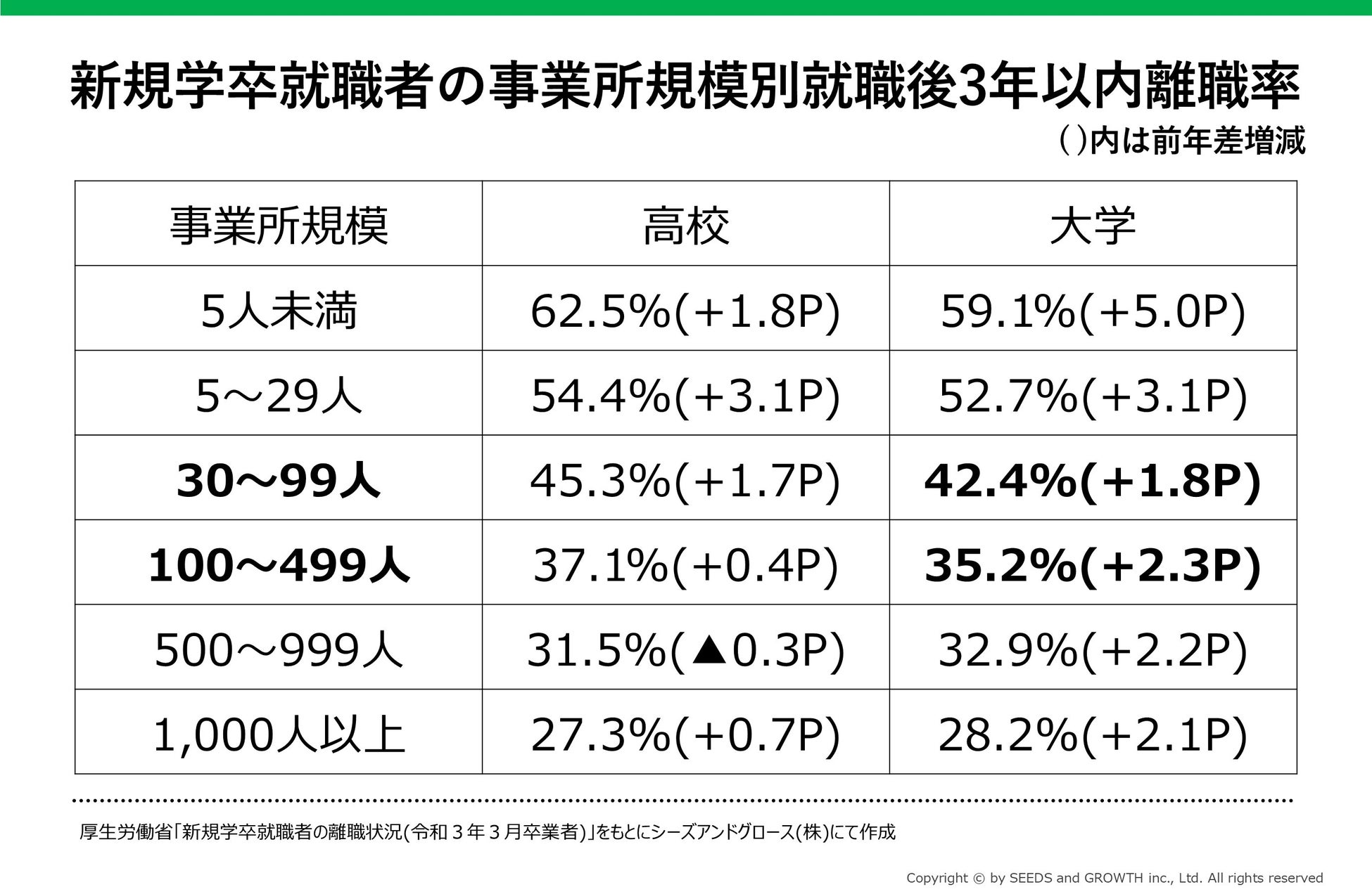 昨今、入社3年以内の離職率が増加し、企業における『人材の定着』が課題となっています。厚生労働省「新規学卒就職者の離職状況(令和3年3月卒業者)」によると、従業員数30~99人の事業所で、3年以内に離職する大卒の割合は42.4%、100~499人の事業所では35.2%と、3年以内の離職率は増加傾向にあります。