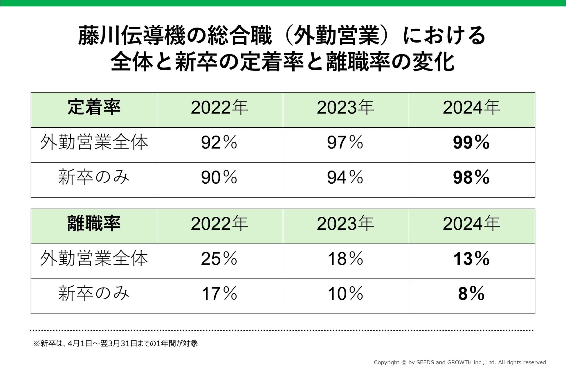 メンター制度導入以前、藤川伝導機の総合職(外勤営業のみ)における退職率は約25%でしたが、2023年7月からメンター制度を導入したことで、2024年度の退職率は13%と低下しました。新卒に限ると、17%から8%まで退職率が低下しました。