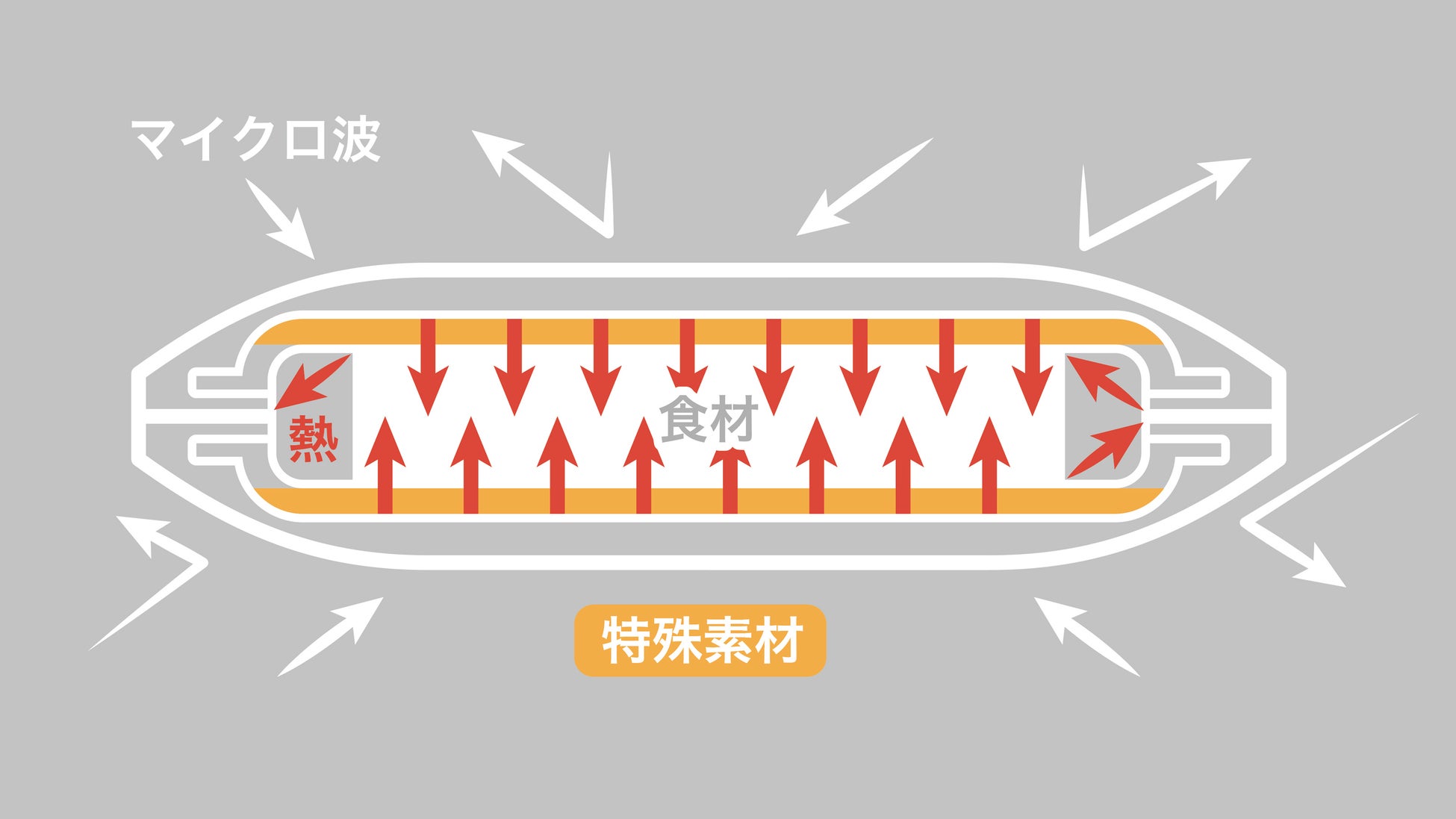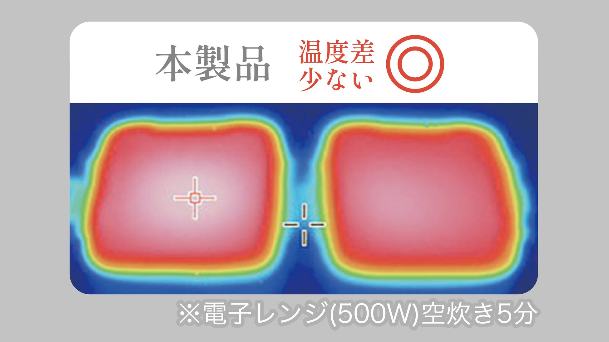 マイクロ波を受けた発熱シリコーン自体が熱源となるため、極めて均一な温度になります。熱ムラが少ないので手軽にオーブントースターで焼いたような調理ができます。